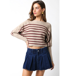 Wrap yourself in cozy sophistication with the Chelsie Sweater in rich burgundy and warm taupe. This timeless striped knit blends soft, neutral tones with a pop of seasonal color—perfect for fall days and holiday gatherings.