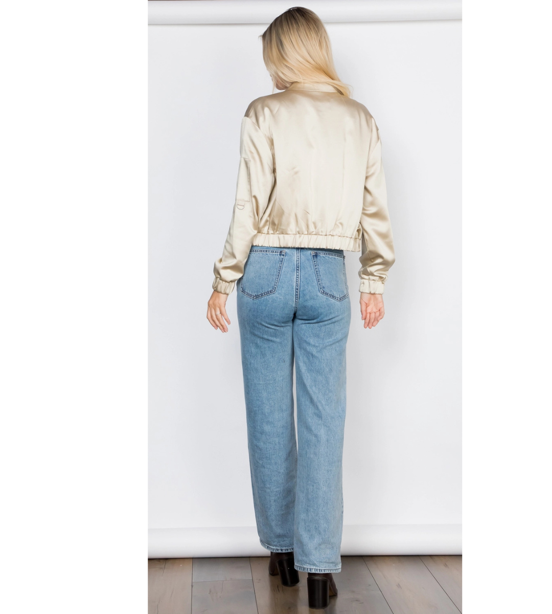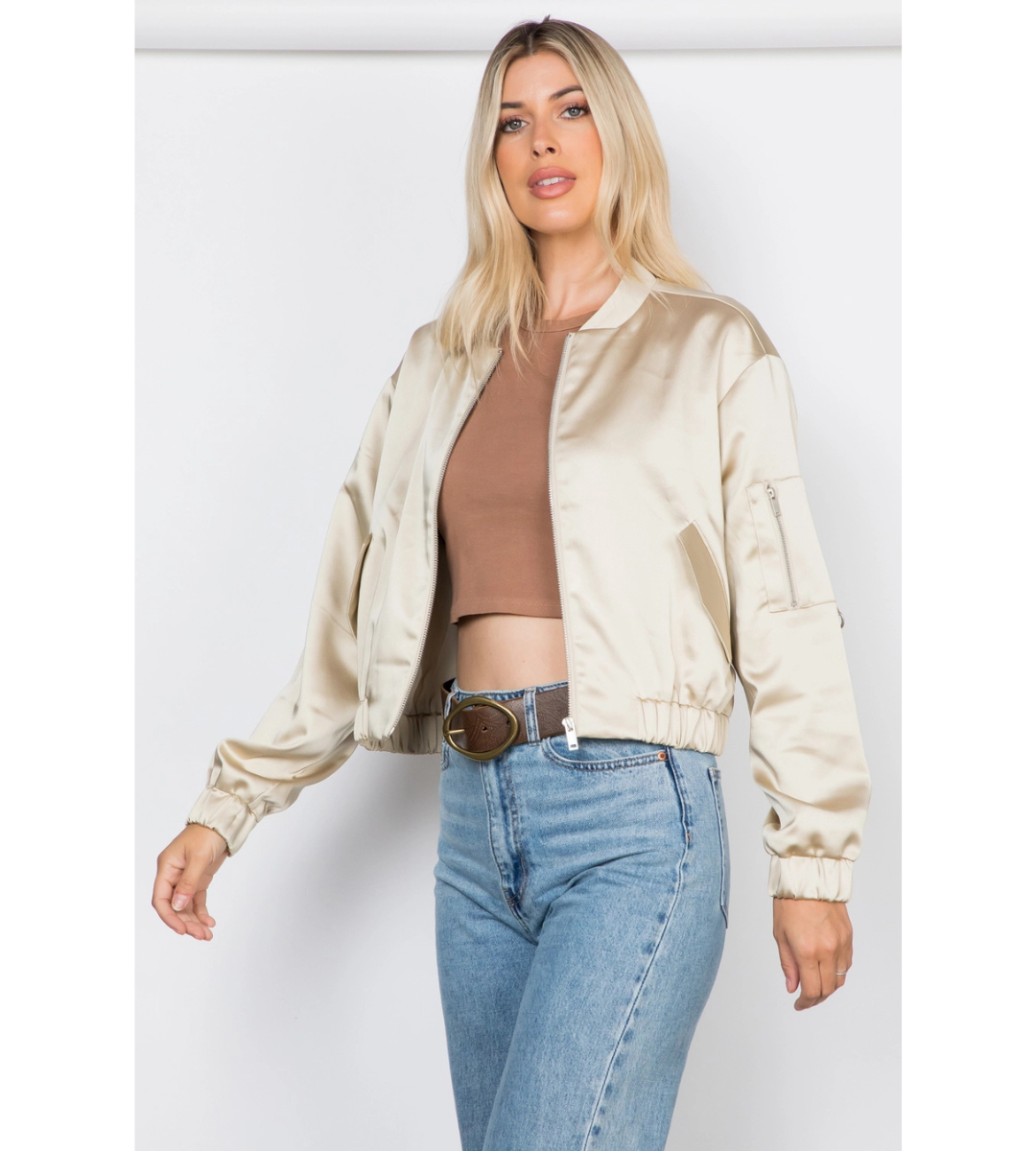 Meet your new go-to layer — the Satin Bomber Jacket. This sleek, lightweight bomber adds effortless polish to any look with its smooth satin finish, relaxed fit, and classic zip-front style. Ribbed cuffs and hem create that signature bomber shape, while the utility sleeve pocket gives it a modern, sporty touch.