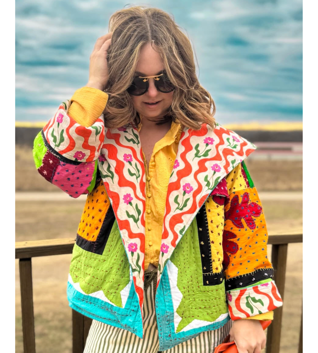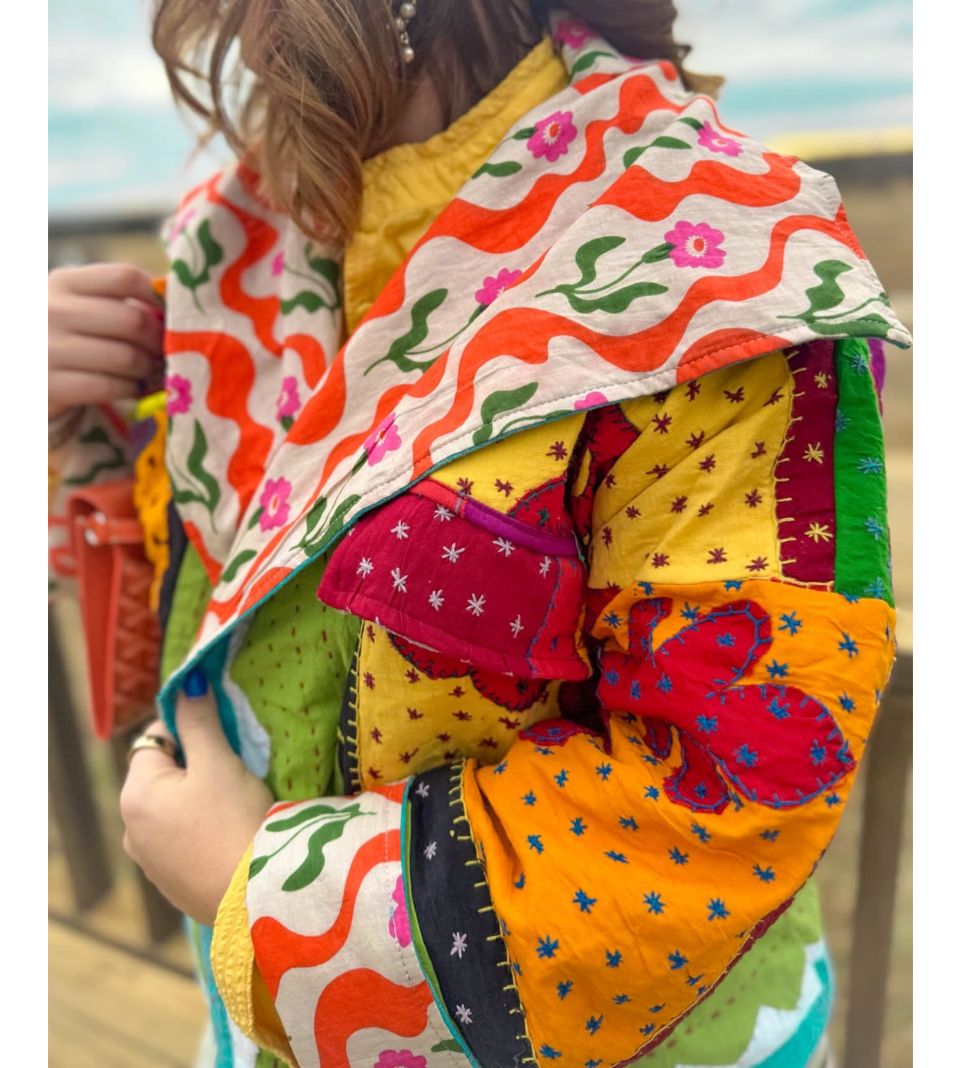 Designed for the most stylish woman, the Heidi Jacket is a one-of-a-kind quilted statement piece featuring intricate patchwork embroidery and a vibrant floral lining. The flattering length, fly-away open collar, and two unique front pockets make it easy to wear and layer.