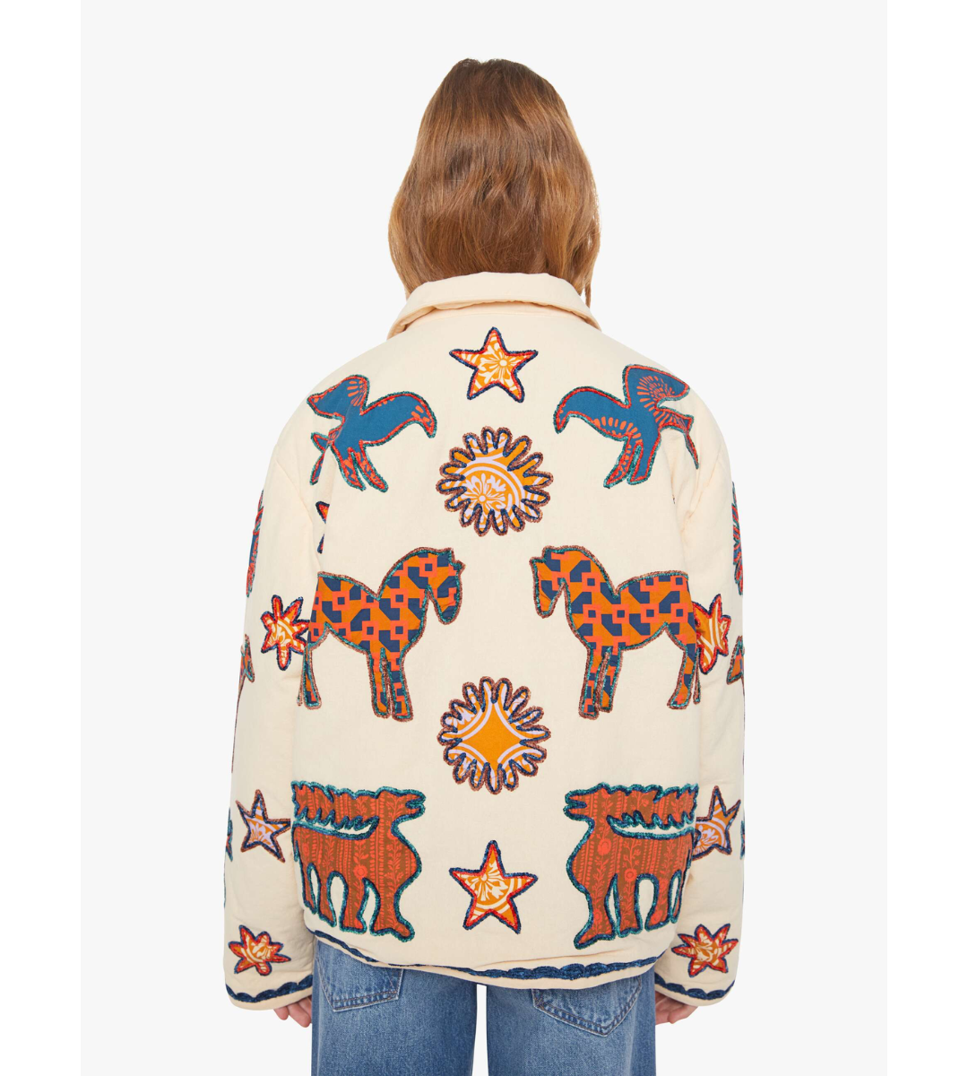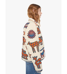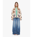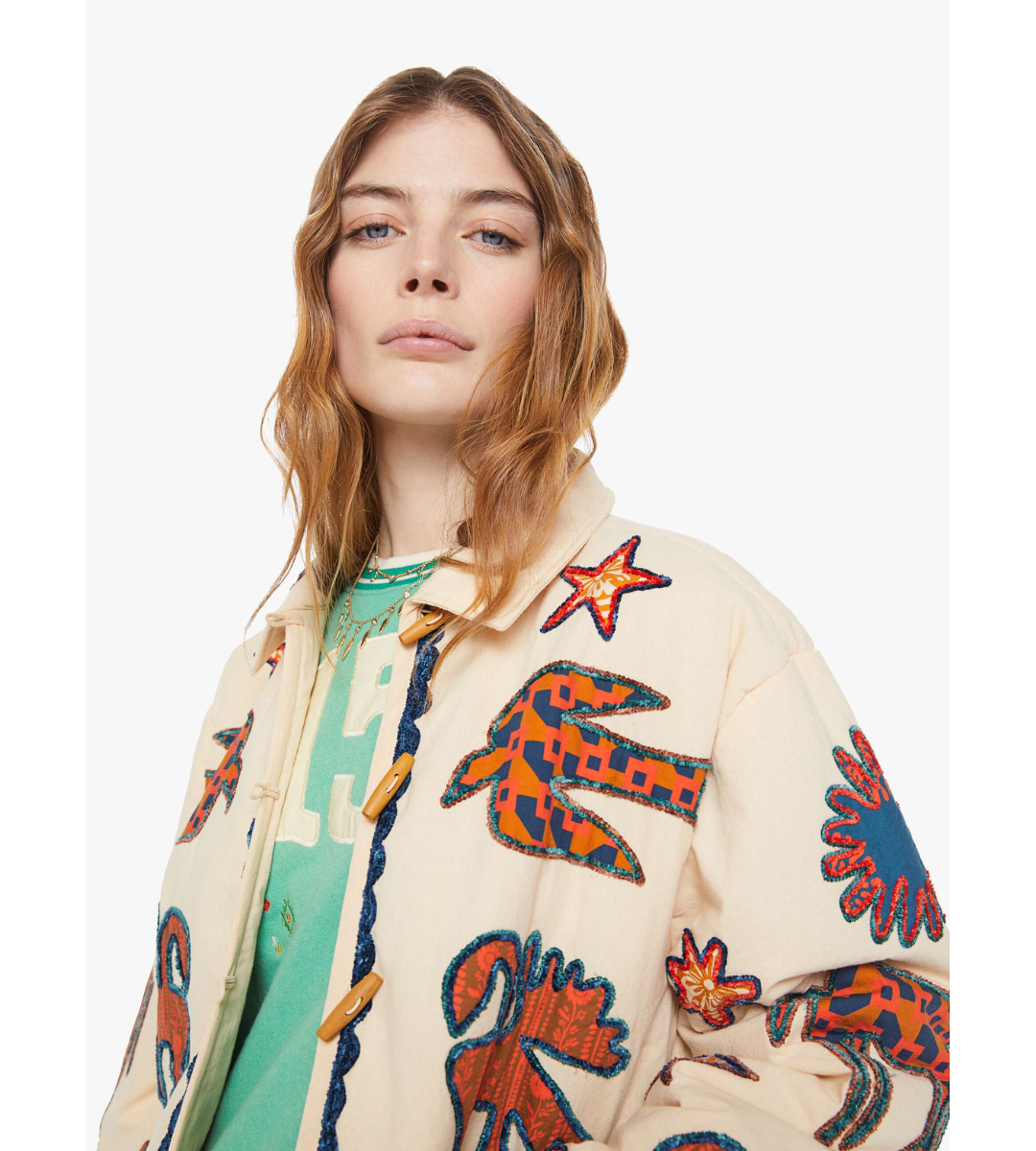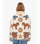 Made from 100% cotton, Stars In My Eyes is a creamy off-white with warm-toned graphics, blue trim and wooden buttons.