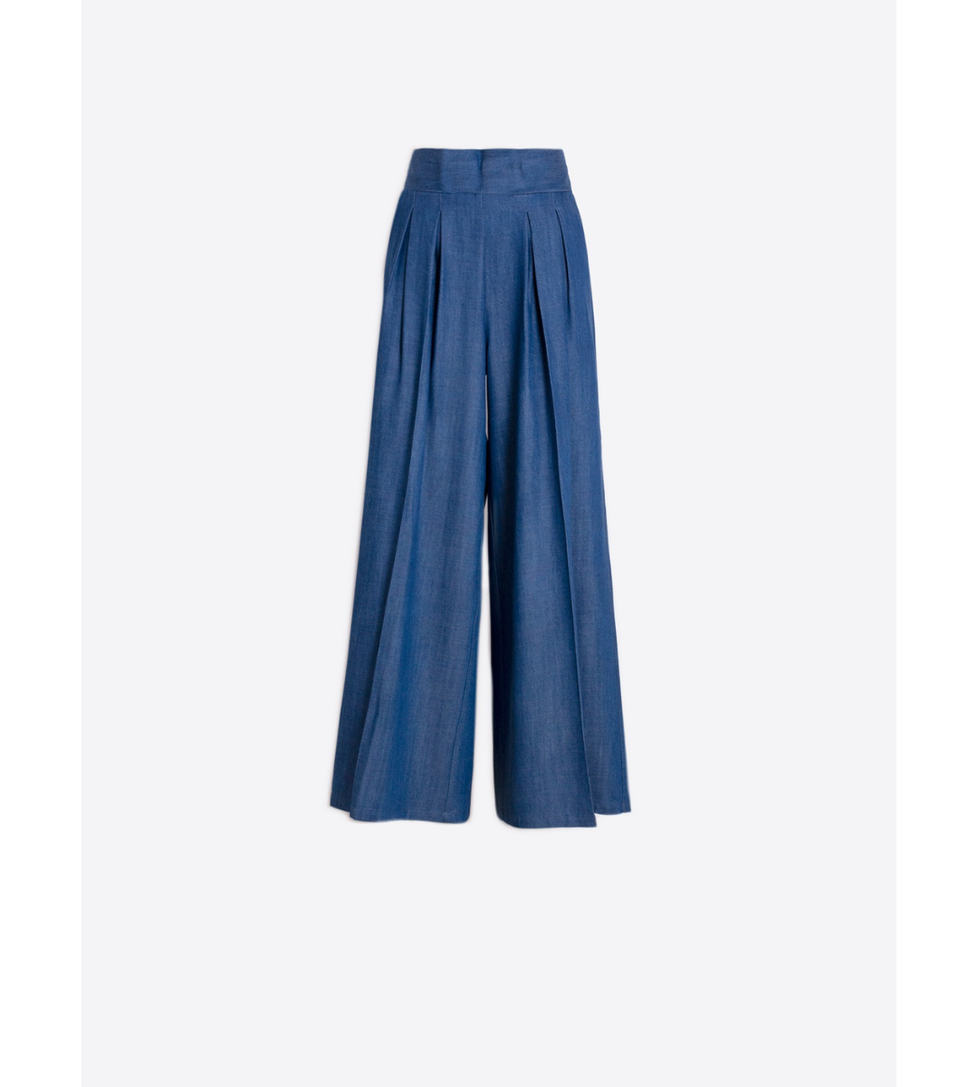 Denim trousers with a wide-leg cut and high-rise waist. Made from lightweight tencel with a soft drape. Front pleats create volume and structure, while the wide waistband enhances the silhouette. The back features an elasticated waist for comfort. No visible pockets or buttons. Straight hem.