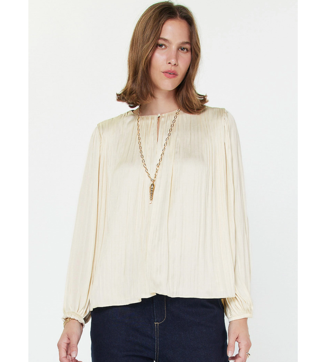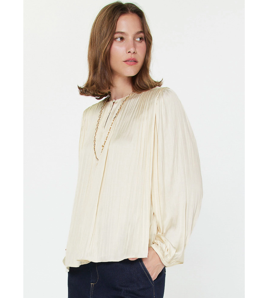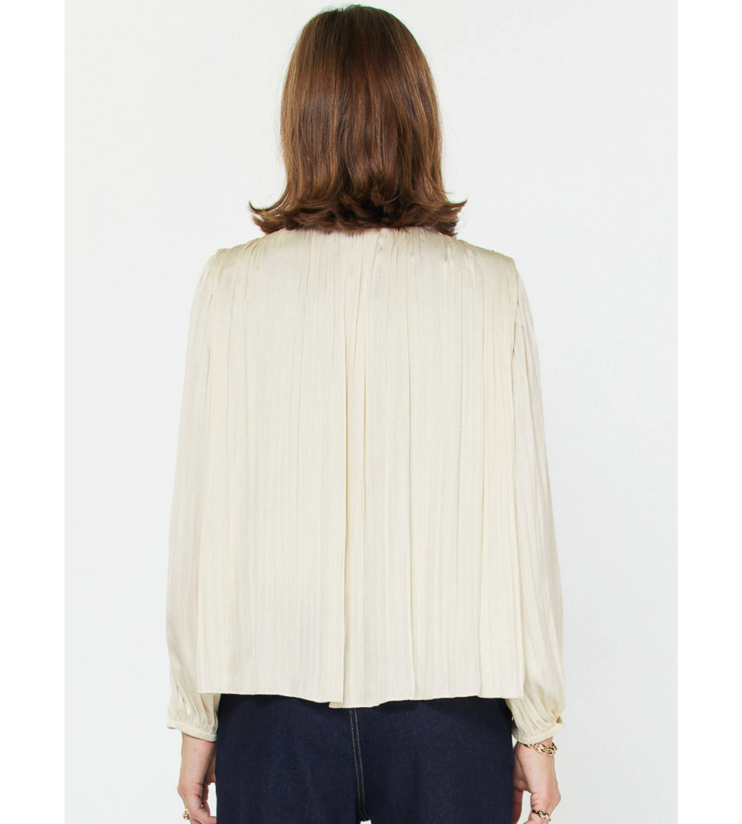 The Mavis Top is a refined pleated blouse that balances structure and softness. Designed with a round neckline and keyhole button closure, it features all-over narrow pleats, long sleeves with elastic cuffs, and a relaxed fit that drapes beautifully. Lightweight and versatile, it's perfect for both polished everyday looks and professional wear.