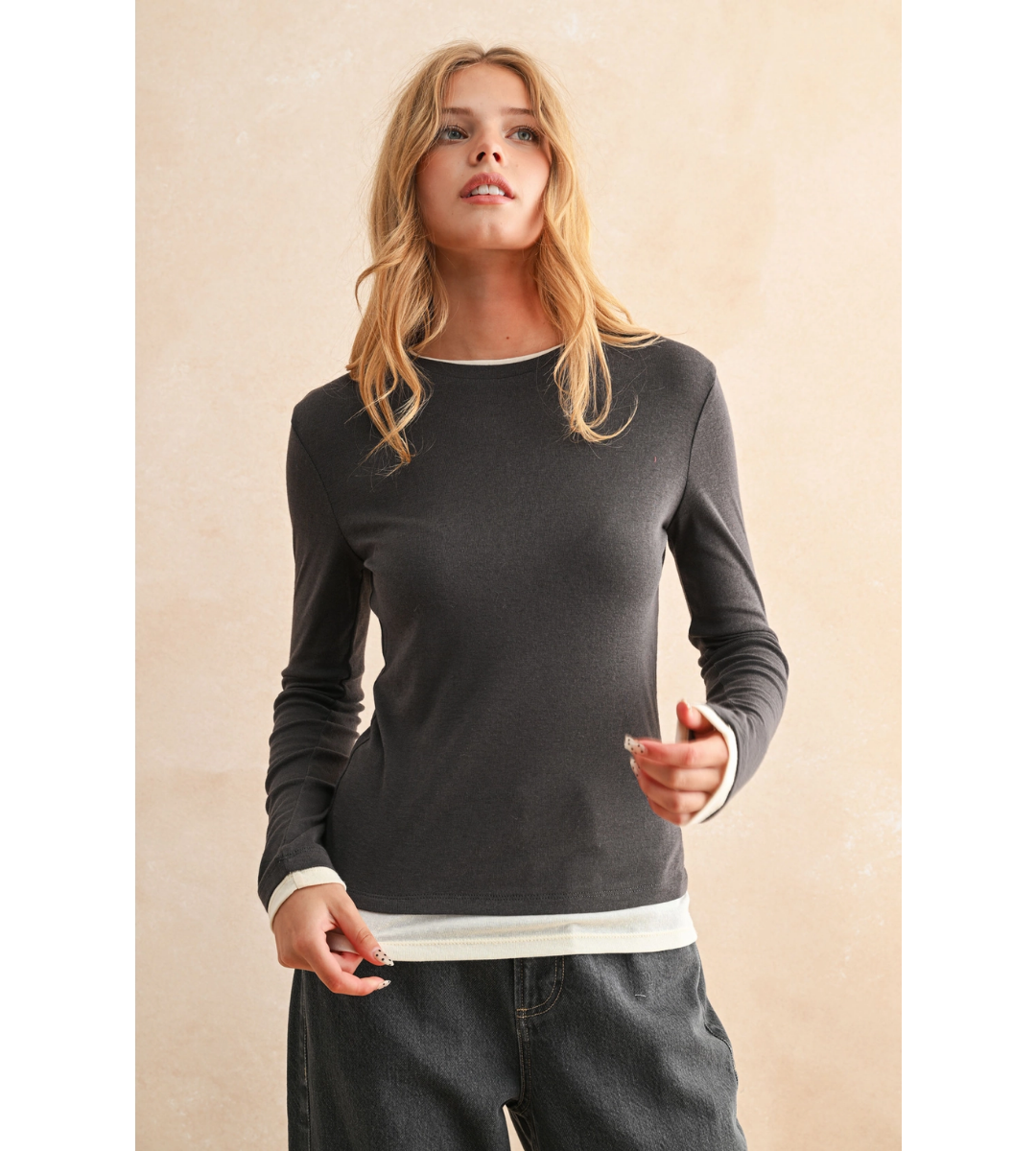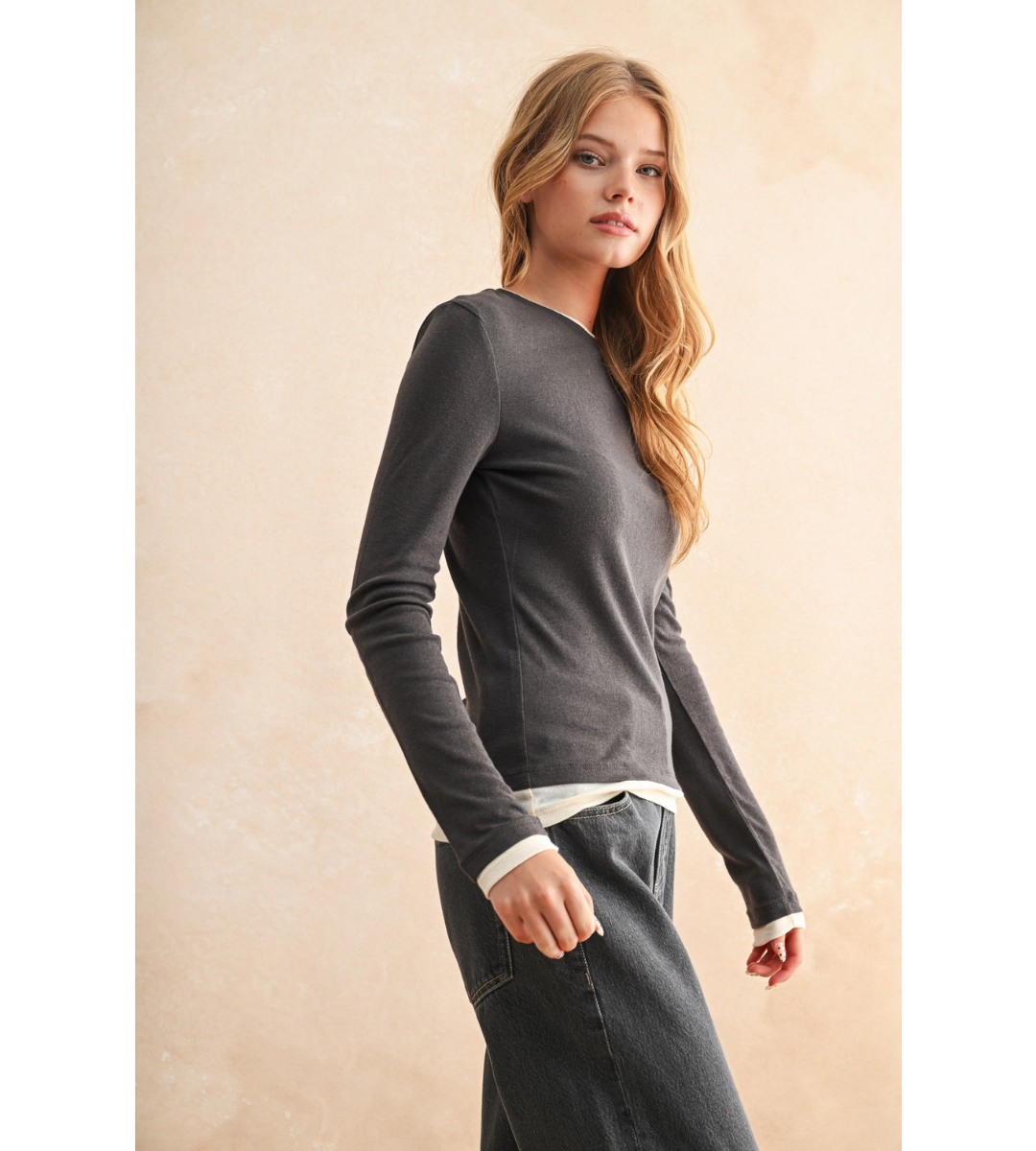 The Mia Top in charcoal offers a slightly moodier take on a casual classic. With its lightweight feel, long sleeves, and understated contrast trim, it’s an elevated basic you’ll reach for again and again. Wear it with denim or joggers for effortless off-duty style.