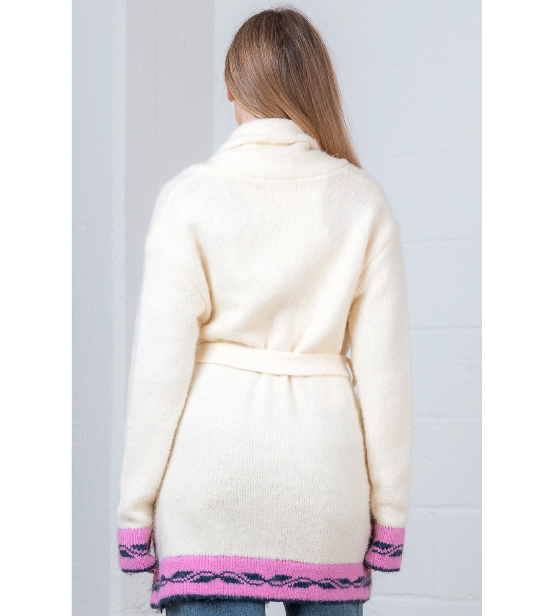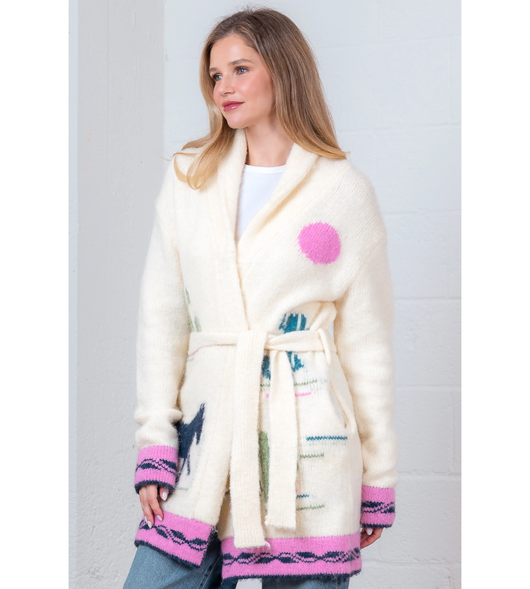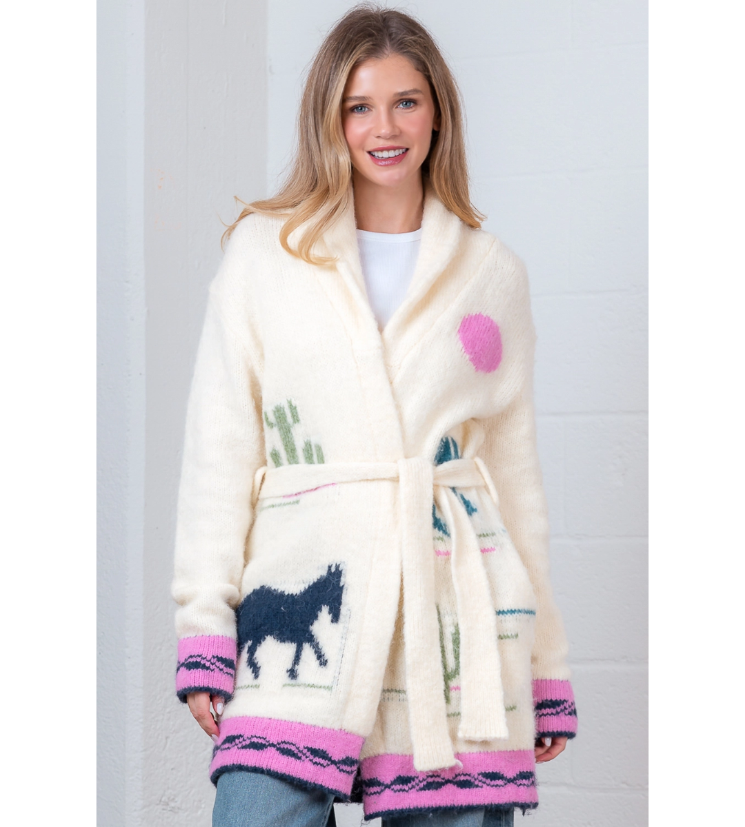 Cozy up in the Nora Sweater — a soft, relaxed-fit robe sweater featuring a striking sunset horse print. Designed in a warm cream hue, this collared style wraps effortlessly with a self-tie belt for customizable comfort. With its long sleeves and laid-back silhouette, the Nora brings a touch of the West to your everyday layers — perfect for throwing on over denim or leggings for an easy, statement-making look.