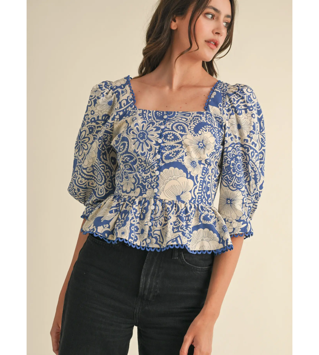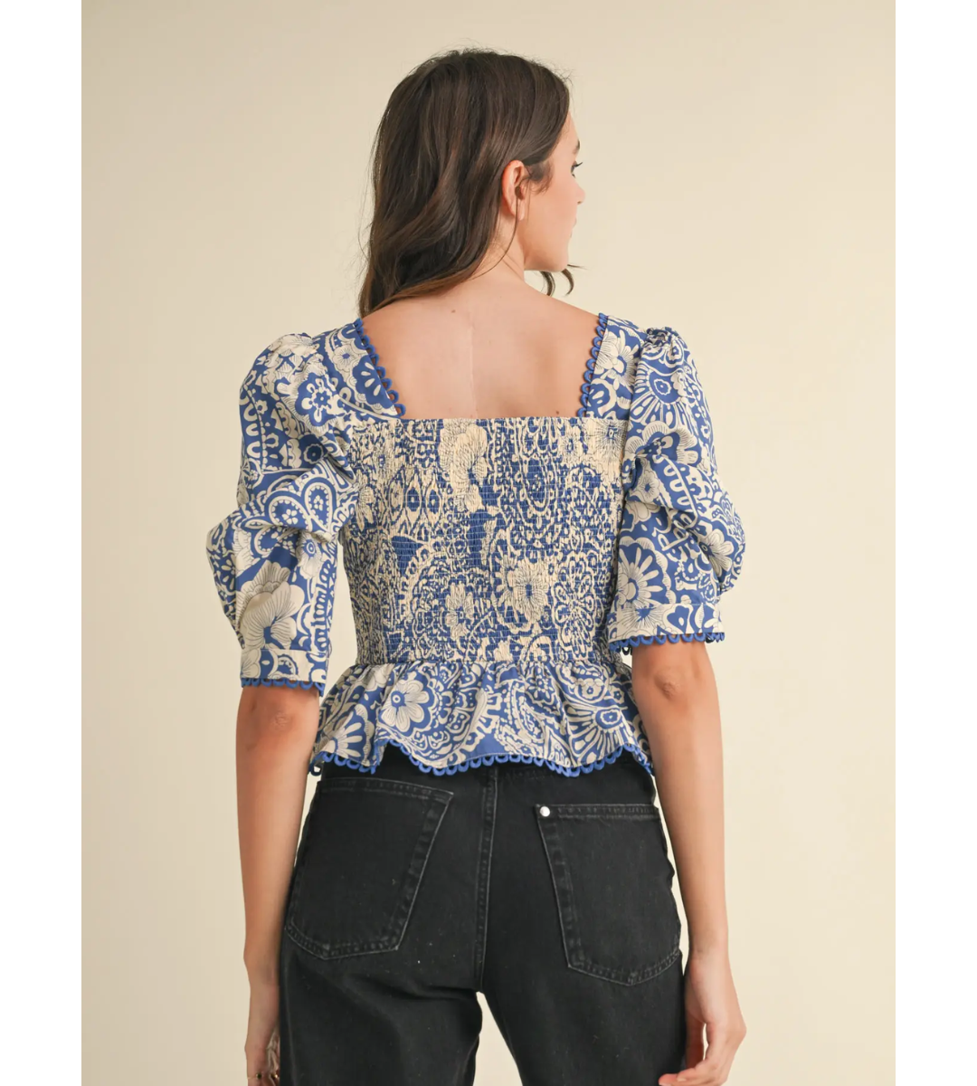 Elevate your style with the Sonnet Top in Indigo, offering a fresh take on a flirty silhouette. The floral paisley fabric shapes a square neckline and a faux button-down placket, both accented with scalloped lace trim. Elbow-length puff sleeves with scalloped lace cuffs and a peplum hem trimmed in matching lace create a feminine, playful feel. The smocked elastic back delivers a snug, flattering fit. The deep Indigo color adds a cool, classic touch to this sweet top.
