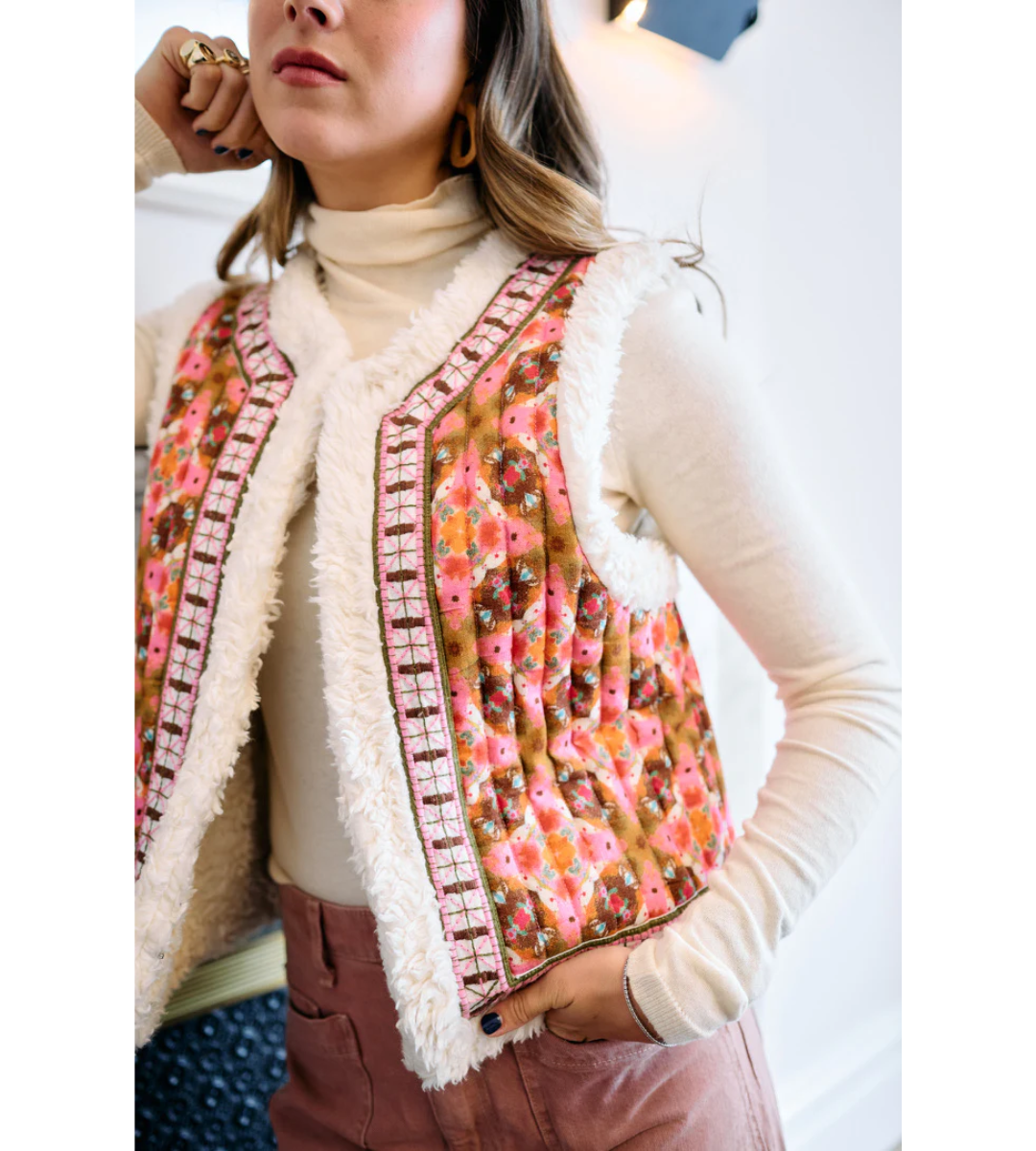 Meet the Willow Vest, the perfect layering piece for fall frolicking and winter wonderlands. Whether paired with a classic white button down for fall festivities or over a cozy turtleneck for cozy cabin getaways, our Willow Vest gives you multiple looks in one with its reversibility. Crafted from a cotton linen blend, this vest is quilted with an embroidered edge and lined with sherpa.