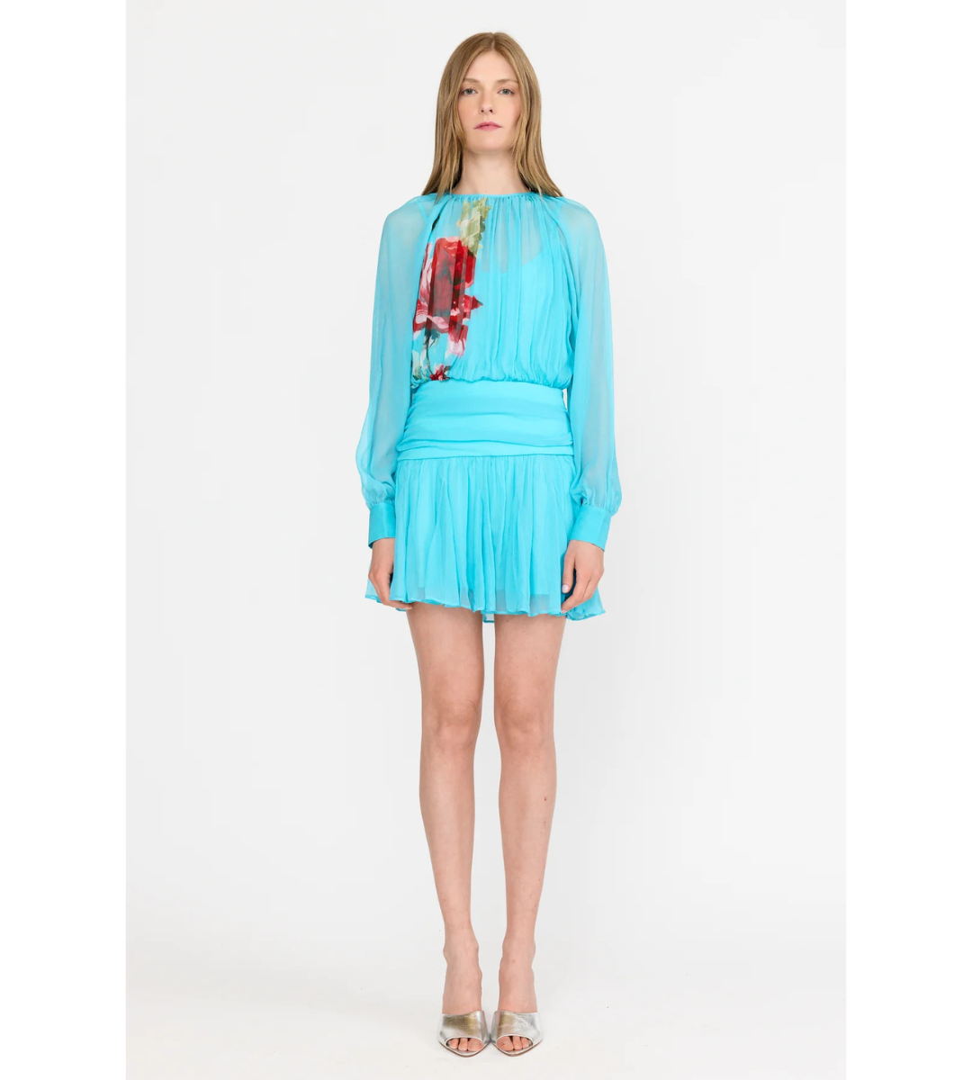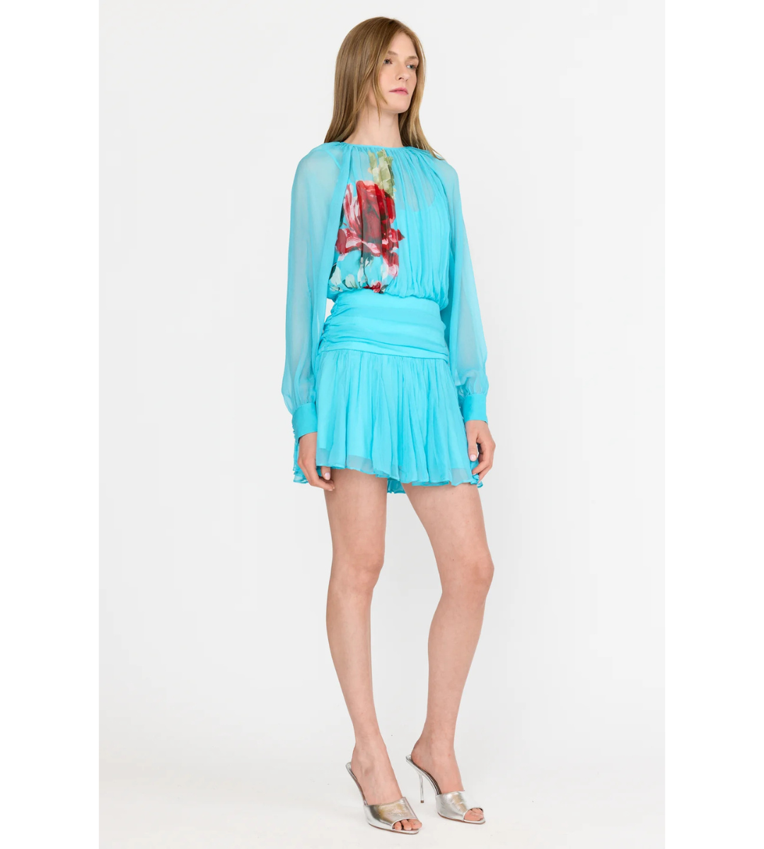 The Billie Dress blends youthful energy with soft romanticism in motion. Crafted from weightless 100% silk chiffon, this feminine silhouette features a softly gathered bodice and blouson sleeves that taper into buttoned cuffs. A wide ruched waistband subtly contours the waist and hips, flowing into a fluid, tiered skirt that moves with natural grace. At the back, a single-button closure reveals an elongated keyhole- an elegant detail that enhances the dress’s effortless charm.