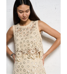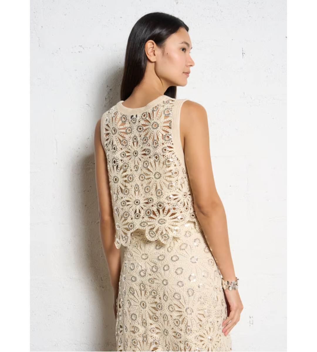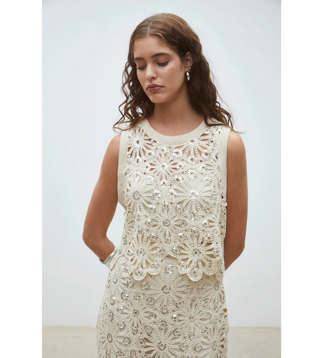 - Delicate lace detailing, silver sequins, opaque underlayer top.