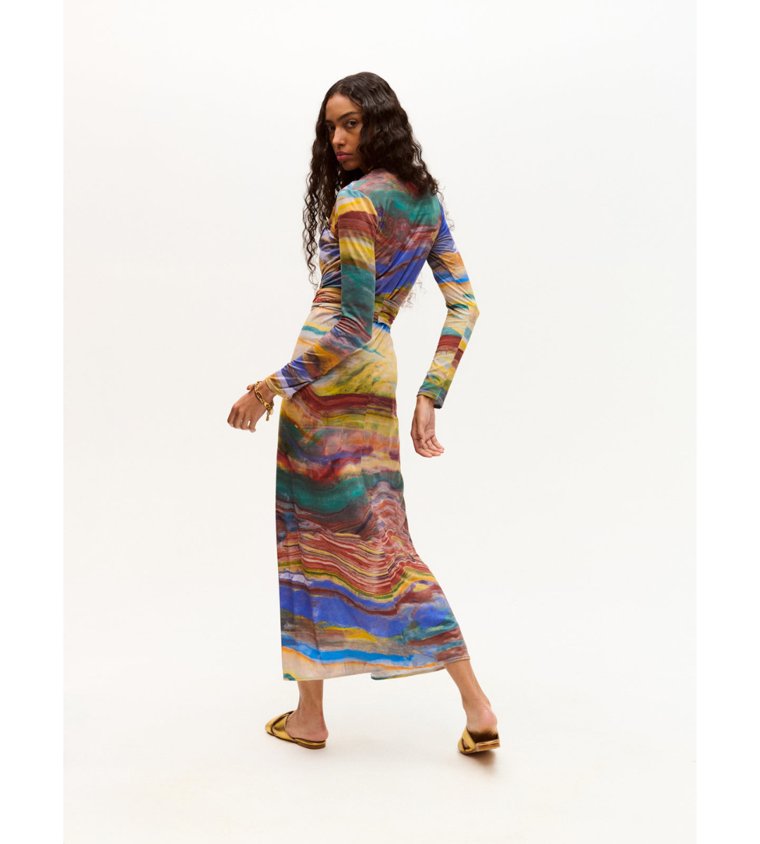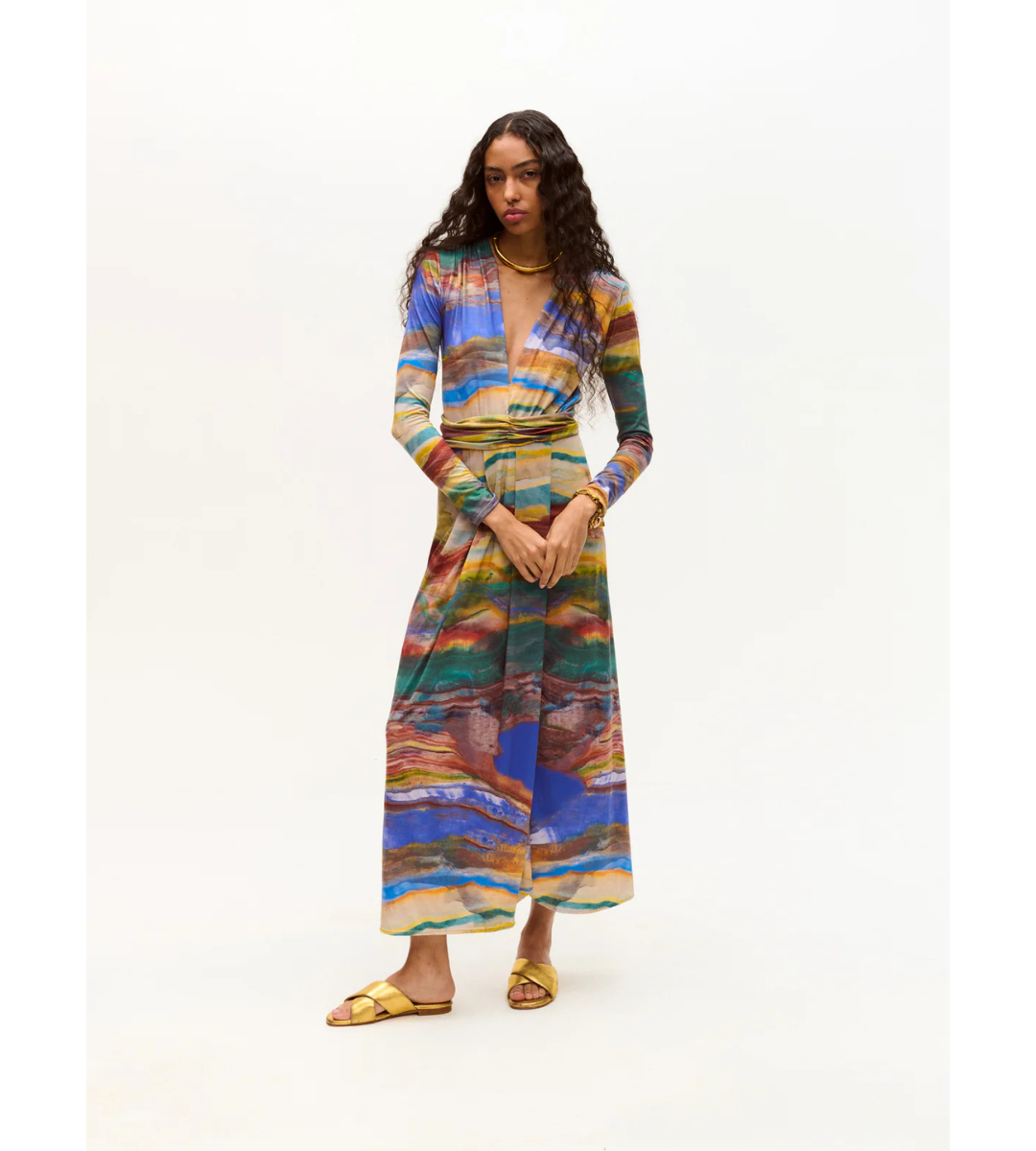Renata Dress features an emerald marble print pattern, long-sleeved maxi dress with a high side slit, deep v-neckline and gathered waist detail, a fitted waistline and a straight silhouette.