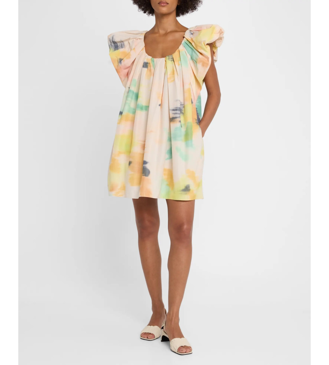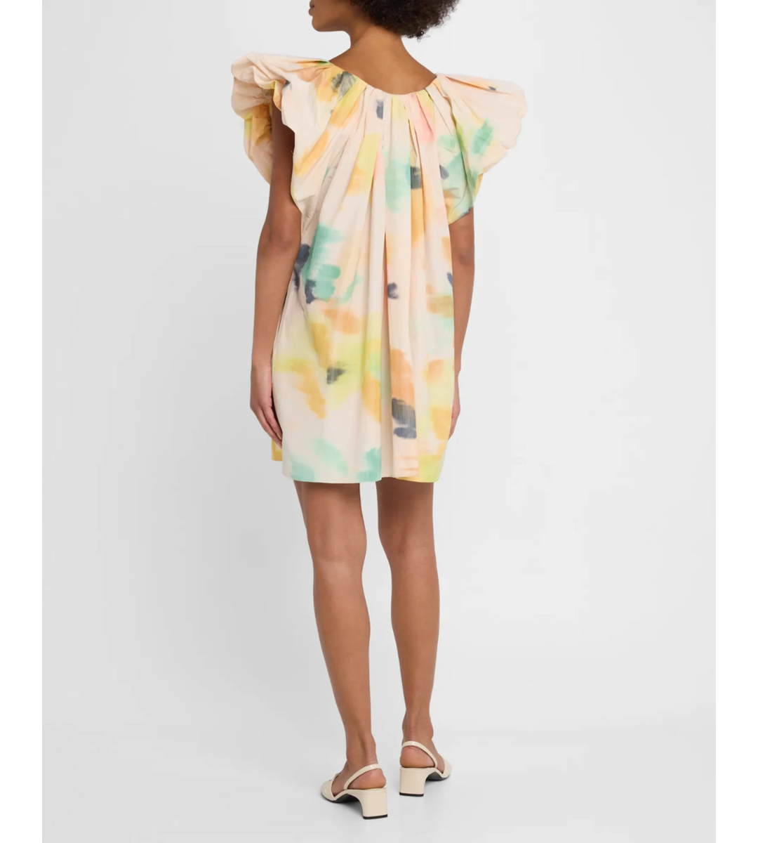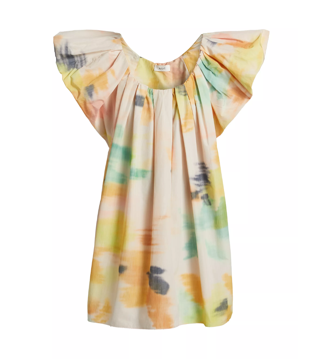Crafted of a cotton blend, the Abi minidress showcases a bright watercolor print. This A-line style is shaped by pleating around the neck and framed by wide flutter sleeves. By A.L.C.