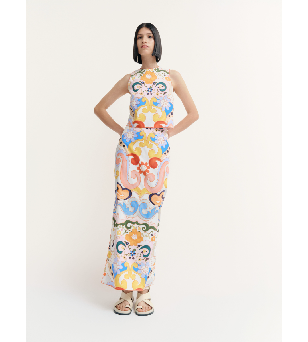 The Pasca Top is a sleeveless blouse with a high neckline and a bright, decorative print. The pattern features flowers, swirls, and bold shapes. The fit is clean and slightly structured, making it a standout piece that’s both artistic and elegant.