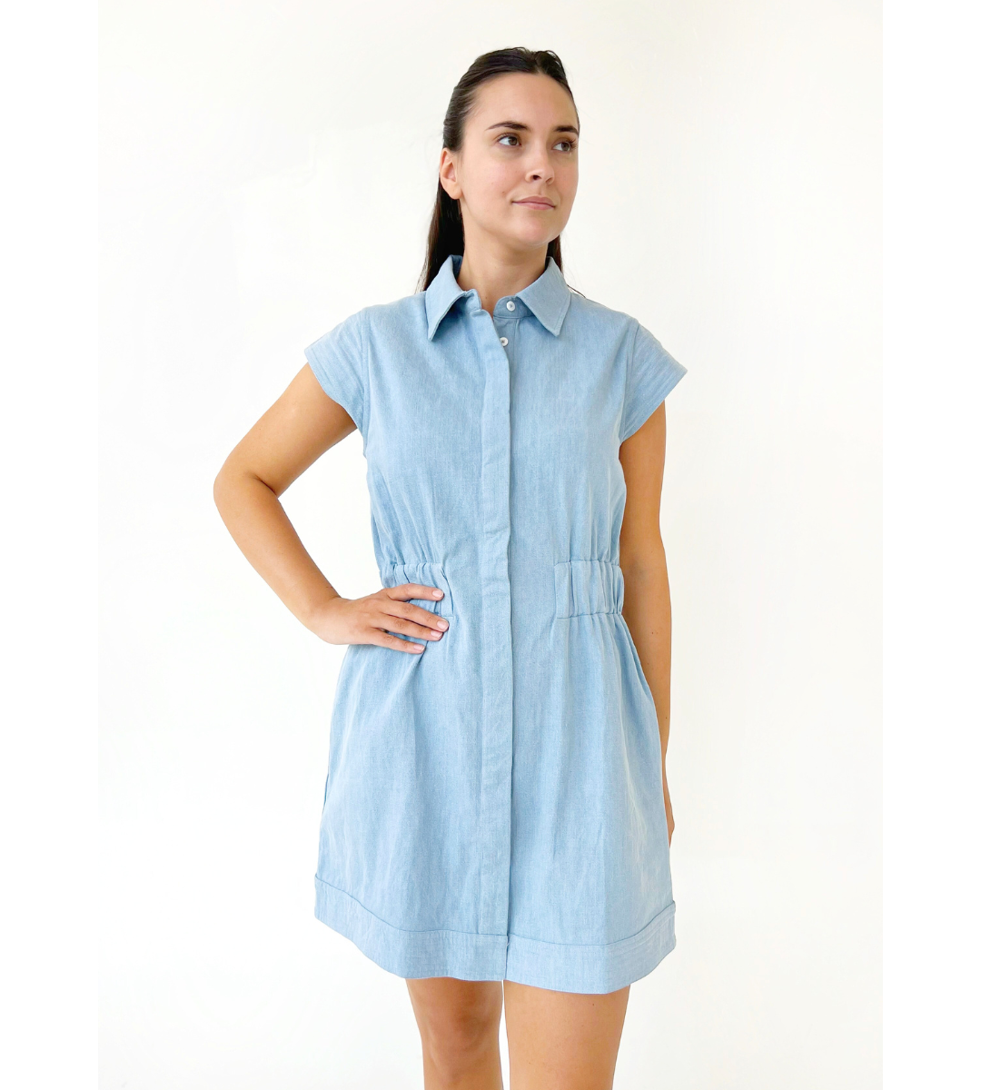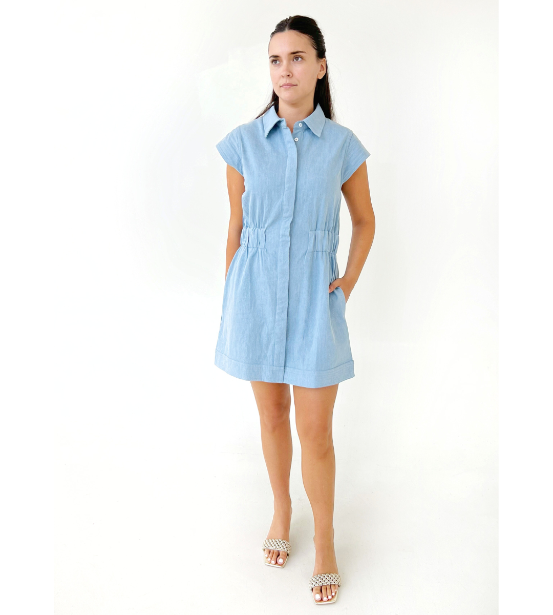 Effortlessly cool and endlessly versatile, the Epaulet Dress blends utility with soft femininity. Crafted from a lightweight chambray fabric, this mini shirt dress features cap sleeves, a structured collar, and a cinched drawstring waist for a flattering silhouette. Side pockets and front buttons add a casual, functional touch—perfect for days when comfort meets style.