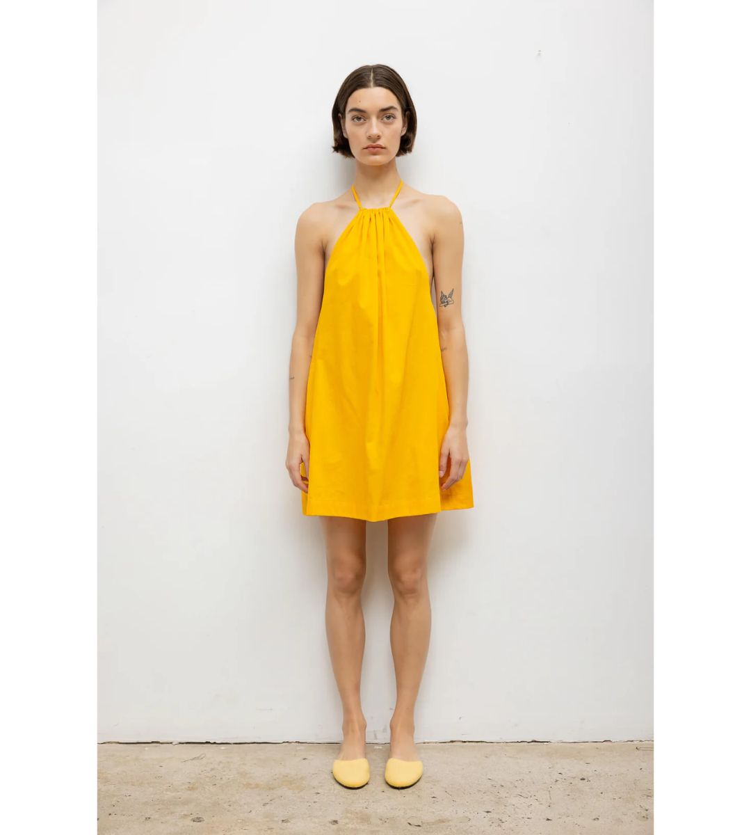 The Yoko Halter Mini Dress features an adjustable, gathered halter neckline, low back, and a swinging mini length.