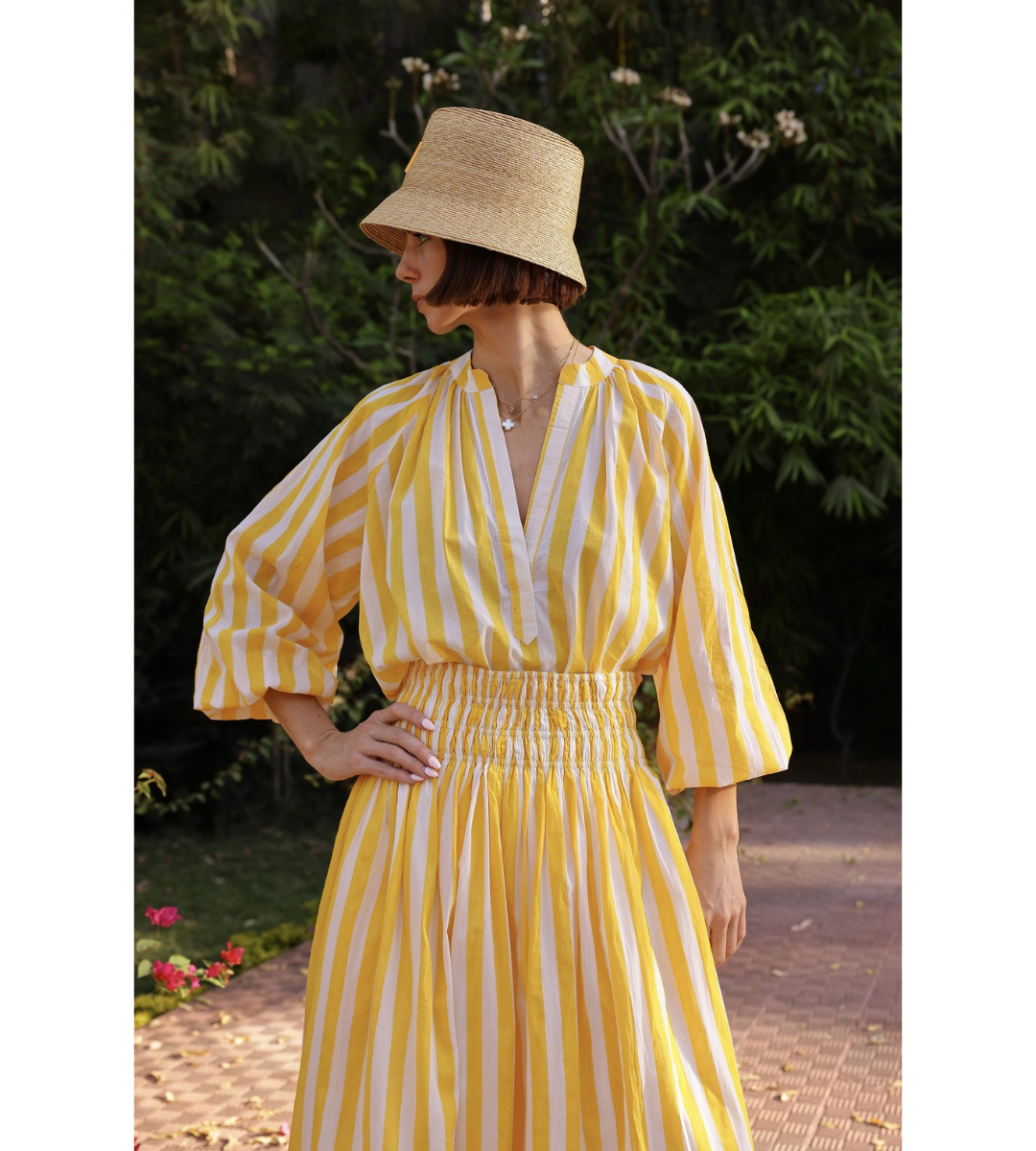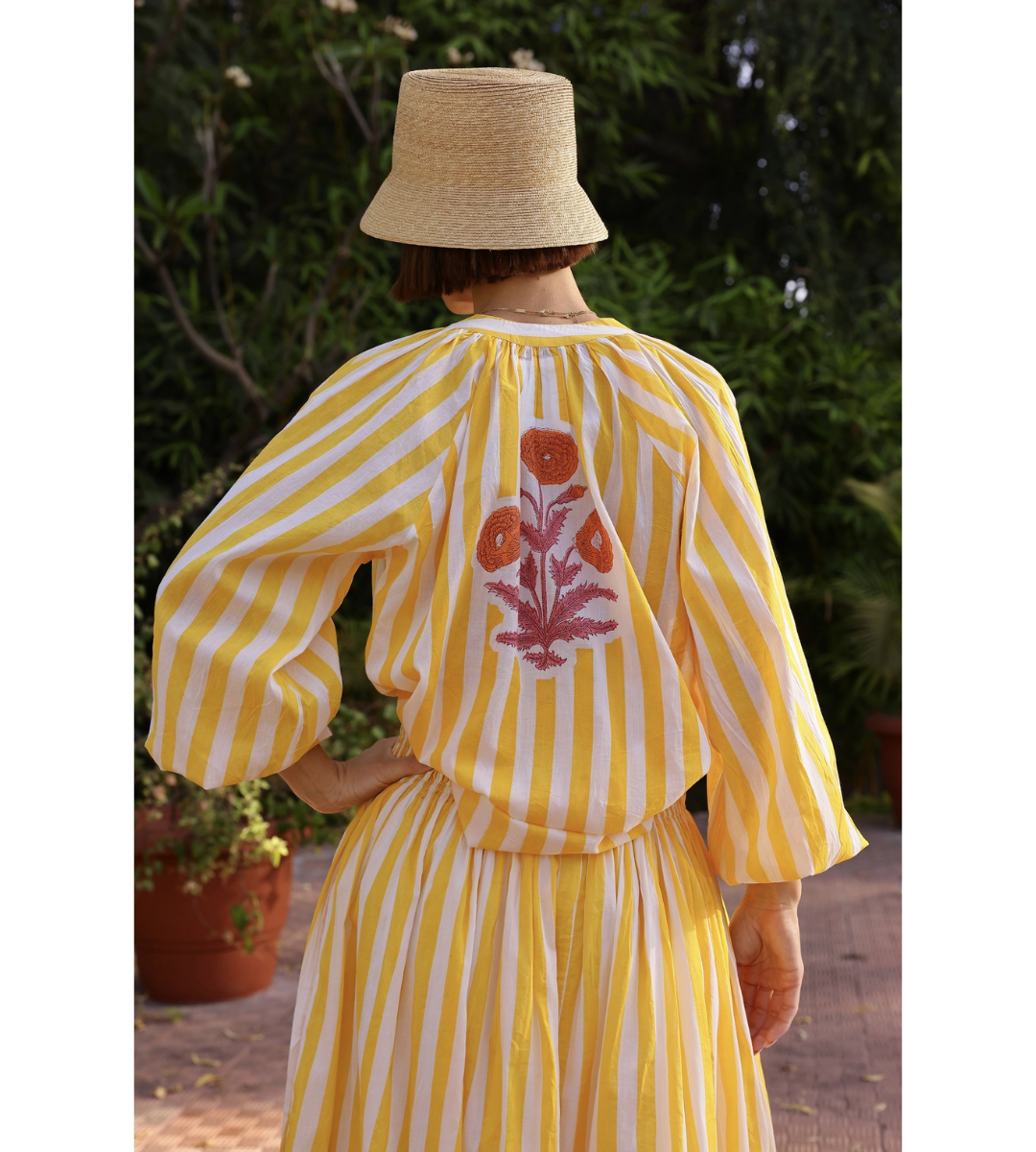 A playful twist on a classic silhouette, the Porto Popover is a warm-weather must-have. Featuring bold yellow and white stripes, this easy-fitting top is designed with a relaxed V-neckline, voluminous 3/4 sleeves, and a breezy shape that flatters every frame. The unexpected floral design on the back adds a charming, feminine surprise — perfect for sun-soaked days or destination getaways.