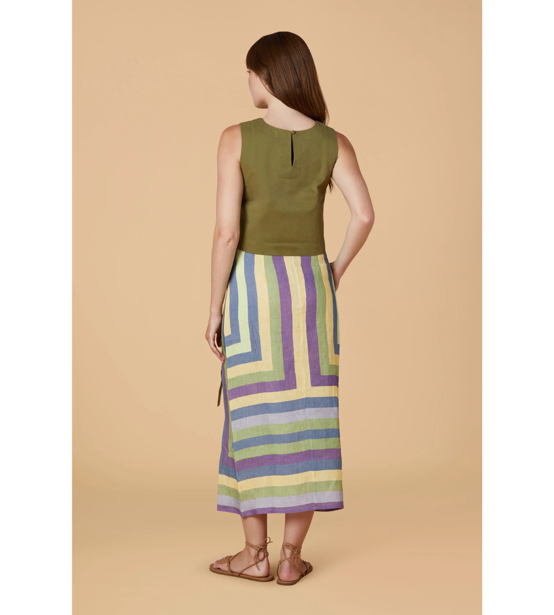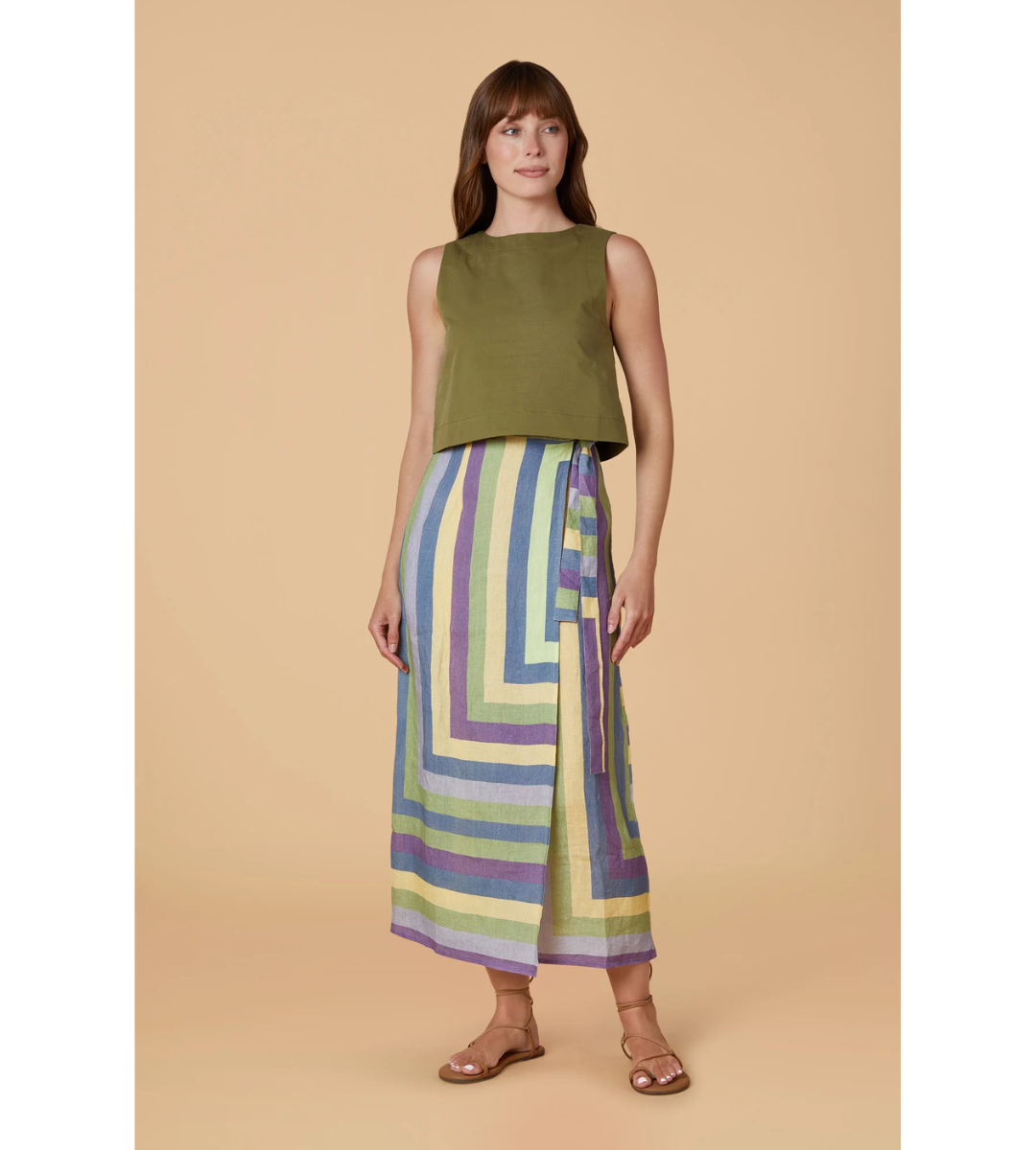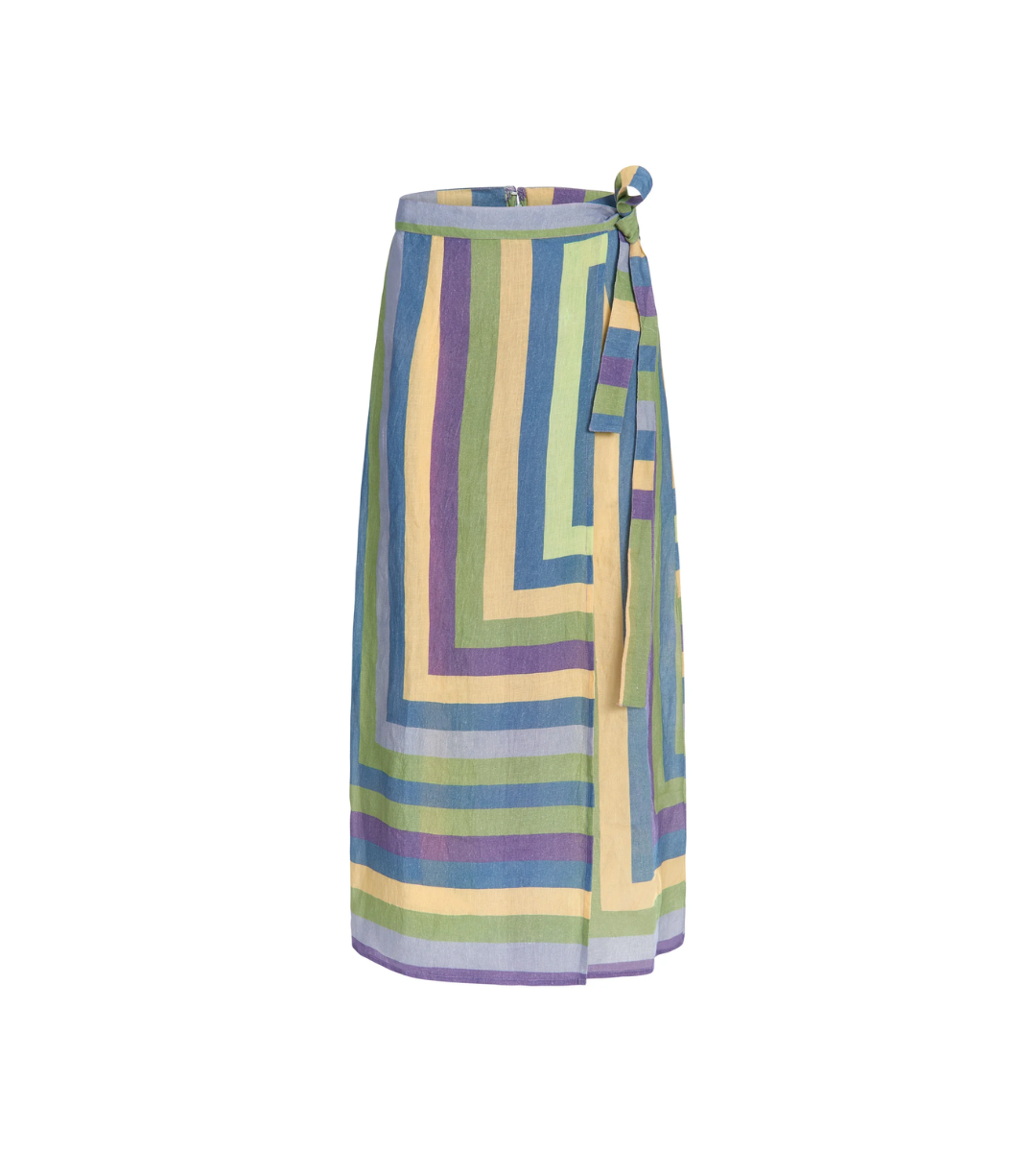 The Leigh wrap skirt is a chic, modern take on classic resort dressing, featuring bold, geometric stripes in a mix of soft yet vibrant hues—muted blue, sage green, golden yellow, and lavender. The wrap silhouette, secured with a self-tie at the waist, offers adjustability and a flattering fit, making it an easy, throw-on-and-go essential for warm-weather styling. Its midi length and architectural stripe layout give it a refined, European-inspired aesthetic—perfect for pairing with a simple tank or crisp blouse for a polished yet relaxed look. Ideal for seaside escapes, city strolls, or effortlessly chic daytime dressing. Olivia by Livro.