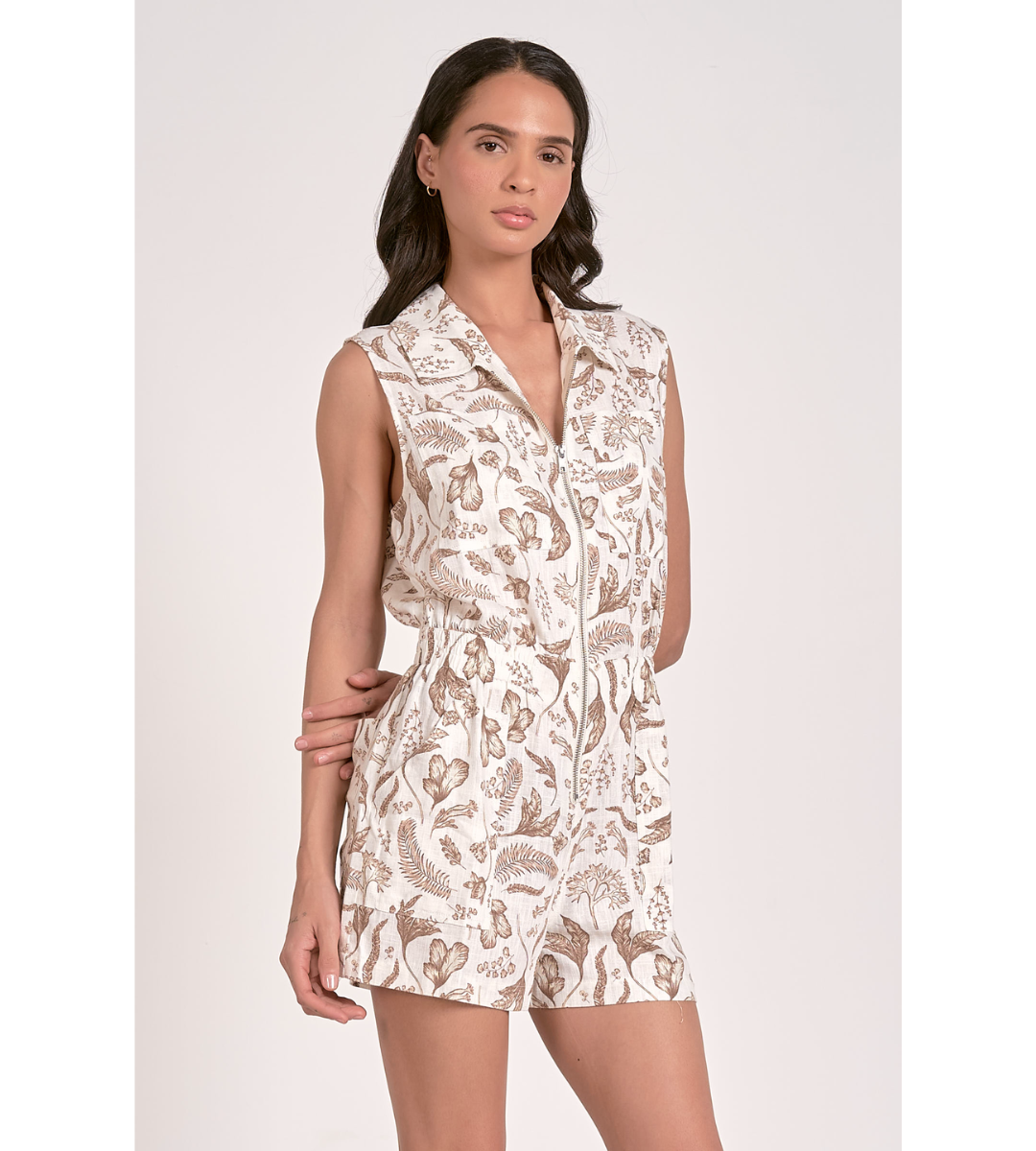 Meet the Rene Romper in brown—a soft, earthy take on our classic silhouette. The vintage-inspired brown and ivory toile print adds a timeless charm, while the structured collar, zip-up front, and elasticized waist ensure comfort with polish. Effortlessly chic and endlessly versatile, this piece pairs well with your favorite sandals for an easy daytime look.