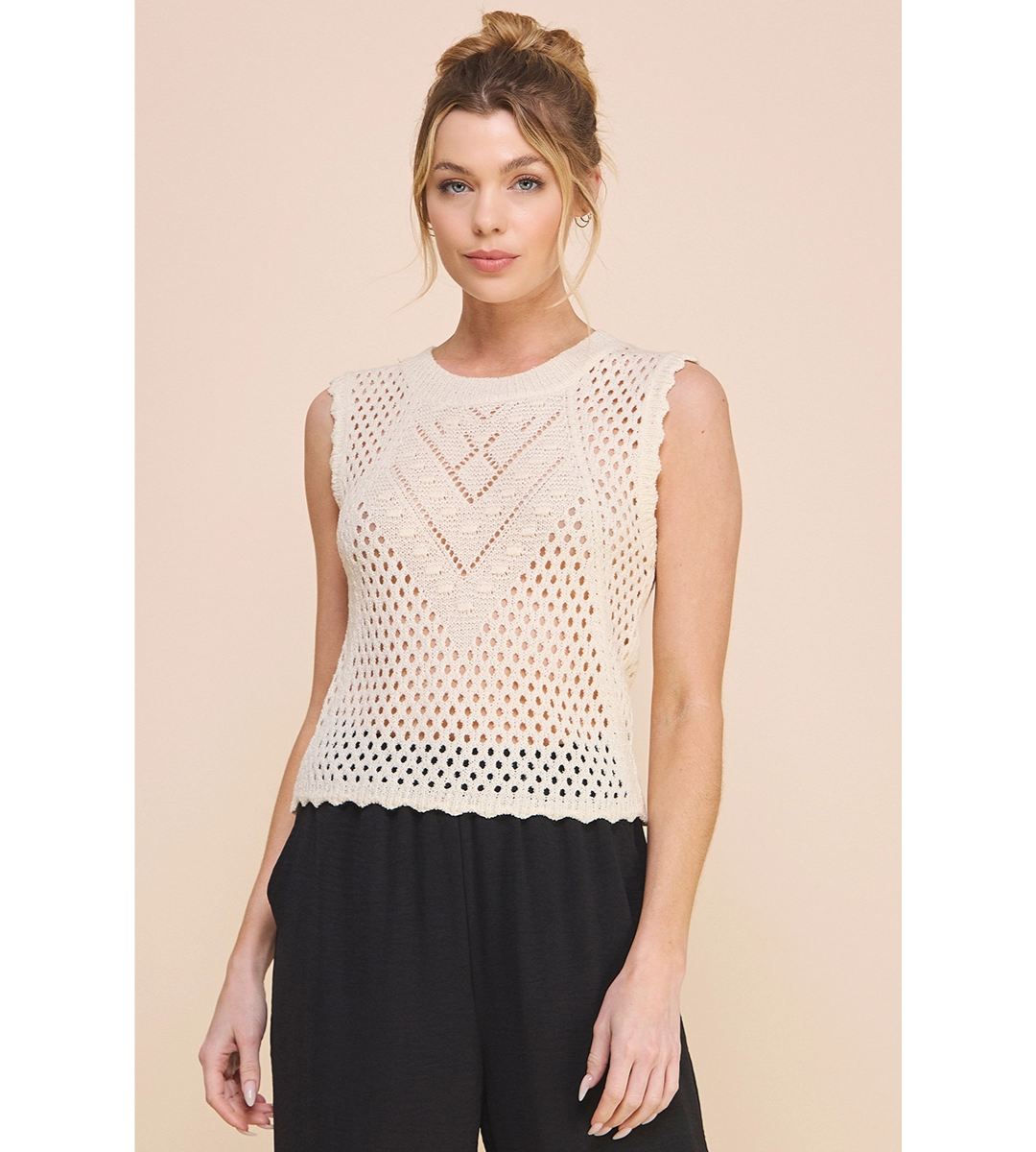 Soft and sweet, the Sienna Top is a pointelle-knit sweater tank crafted in a creamy, buttery hue that adds a subtle warmth to any outfit. Featuring delicate scalloped edges and a crochet-style texture, this sleeveless tank offers a lightweight, breathable feel perfect for layering or wearing on its own. With a contemporary fit that flatters every silhouette, it’s an effortlessly chic addition to your wardrobe. Made from 100% acrylic for comfort and durability.