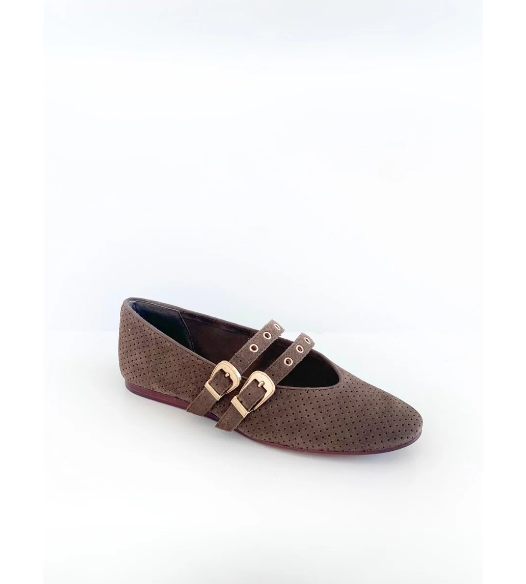 The Baylee Flat in dark olive makes a statement out of her double strap mary-jane design with gold metal grommets and bold buckles. This sustainably-crafted flat boasts sustainable materials and a bevy of colorways in perforated or printed suede for one on-trend and versatile ballet flat.