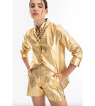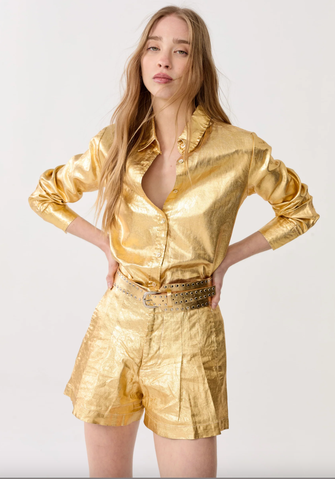 High-waisted Frida shorts are designed with a structured waistband for added support and comfort. These shorts are perfect for those who love a snug fit around the waist and have a defined waistline. They offer a flattering silhouette and are ideal for creating a chic, polished look. They are surprisingly soft and comfy, as they are crafted with 100% natural linen, finished with a metallic coating.  They have side pockets and front zipper fastening with a hook.