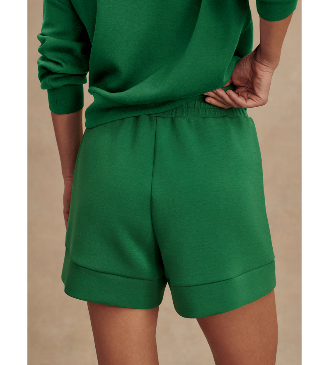 The Atrium shorts, made in DoubleSoft fabric, feature an elegant A-line cut. Perfect for spring/summer and daily wear, these shorts effortlessly pair with knitwear and matching DoubleSoft tops, boasting a dipped drawcord and deep hem panel for added style.