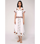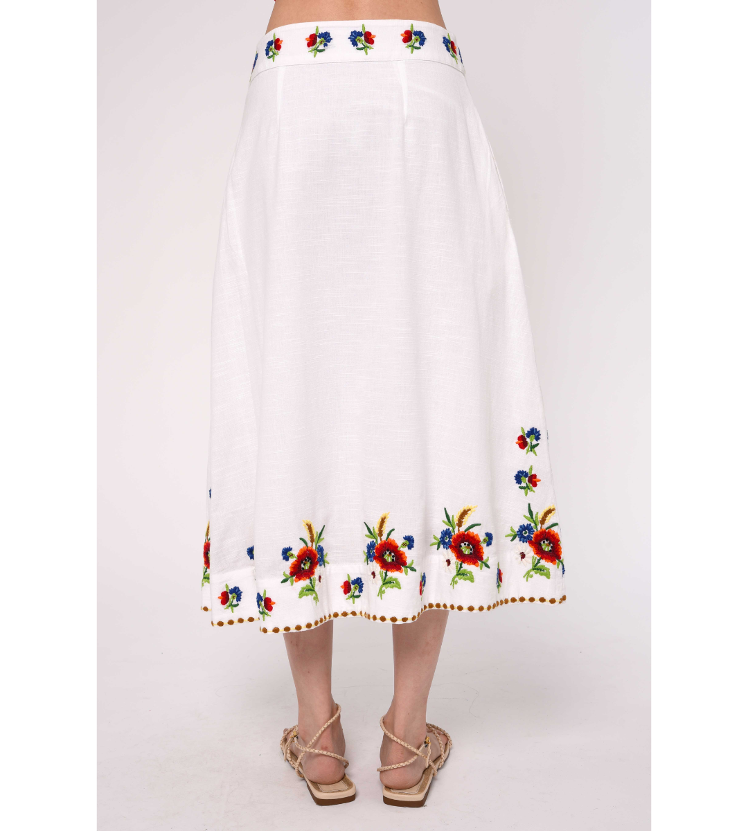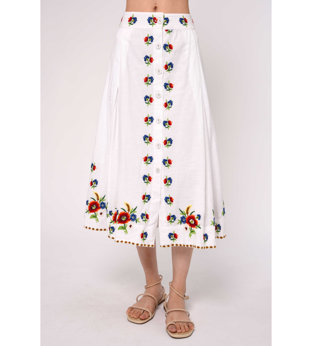 The Berri Midi Skirt is a beautifully crafted A-line piece featuring intricate floral embroidery that mirrors the artisanal detail of the Florinda Top. Designed with a classic button-down front and a high-waisted fit, it creates a sophisticated and cohesive head-to-toe look when paired as a set.