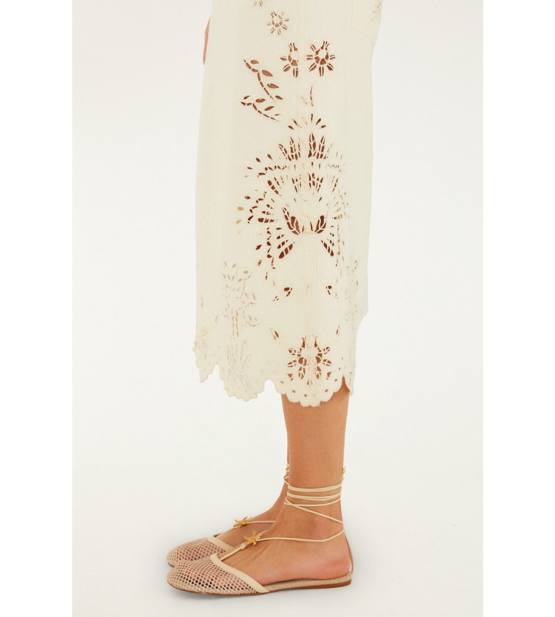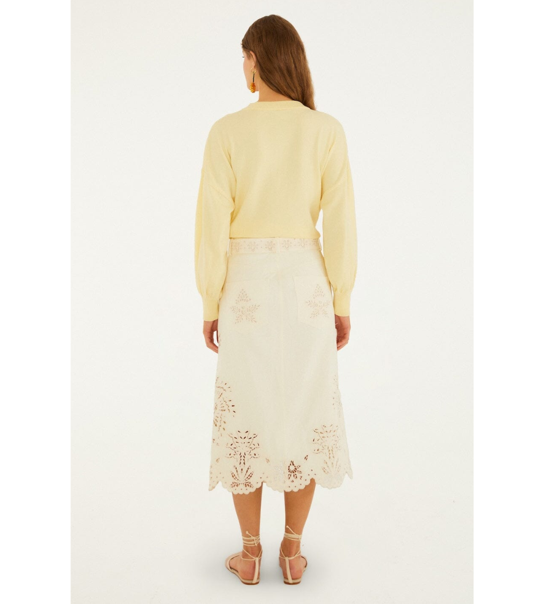 Embrace effortless charm with the Beige Geometric Richelieu Twill Midi Skirt from FARM Rio. This piece features a warm beige tone adorned with intricate geometric Richelieu cutouts, adding delicate texture and subtle playfulness.