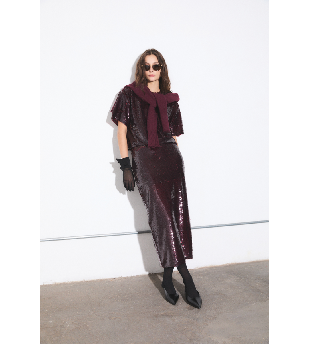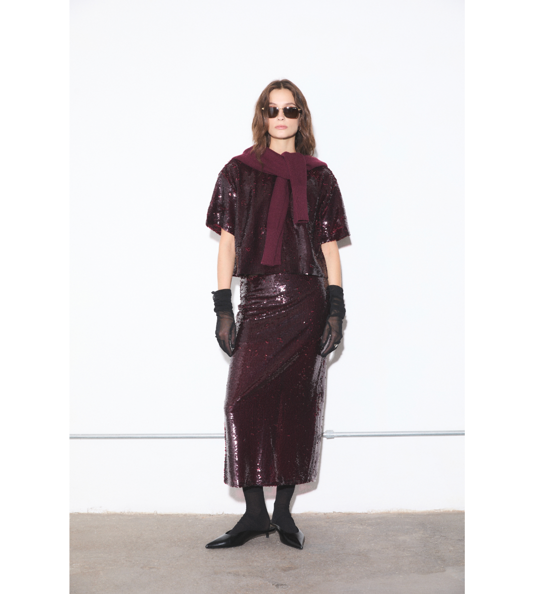 Make a dazzling entrance in the Logan Skirt, a show-stopping piece covered entirely in rich burgundy sequins. This midi-length, pencil silhouette offers a flattering, straight fit that catches the light with every movement. Perfect for holiday parties, festive occasions, or elevating any evening look, the Logan Skirt brings instant, undeniable glamour.