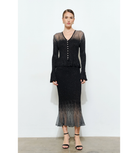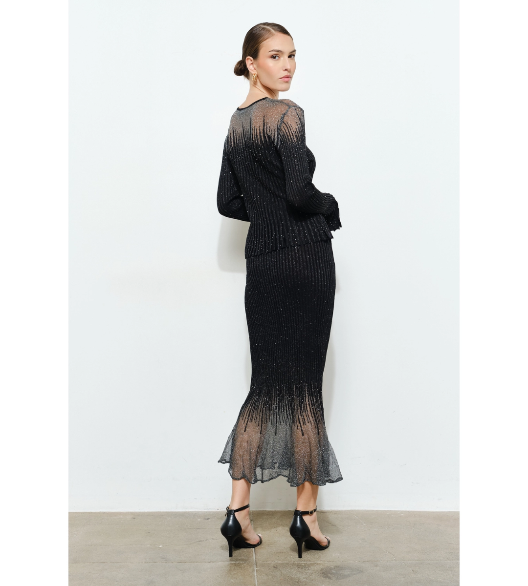 Glitter metallic midi skirt with elegant hem detail perfect for any hoilday party!