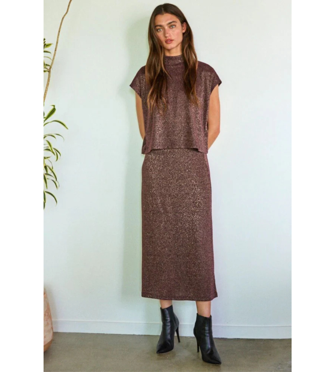 No one will ever be able to dull your shine when you step out in this Lurex midi skirt! Stretchy knit fabric with dazzling Lurex threading throughout shapes this eye-catching skirt. A flared silhouette flatters your curves as it falls to a chic midi hem with a back slit.