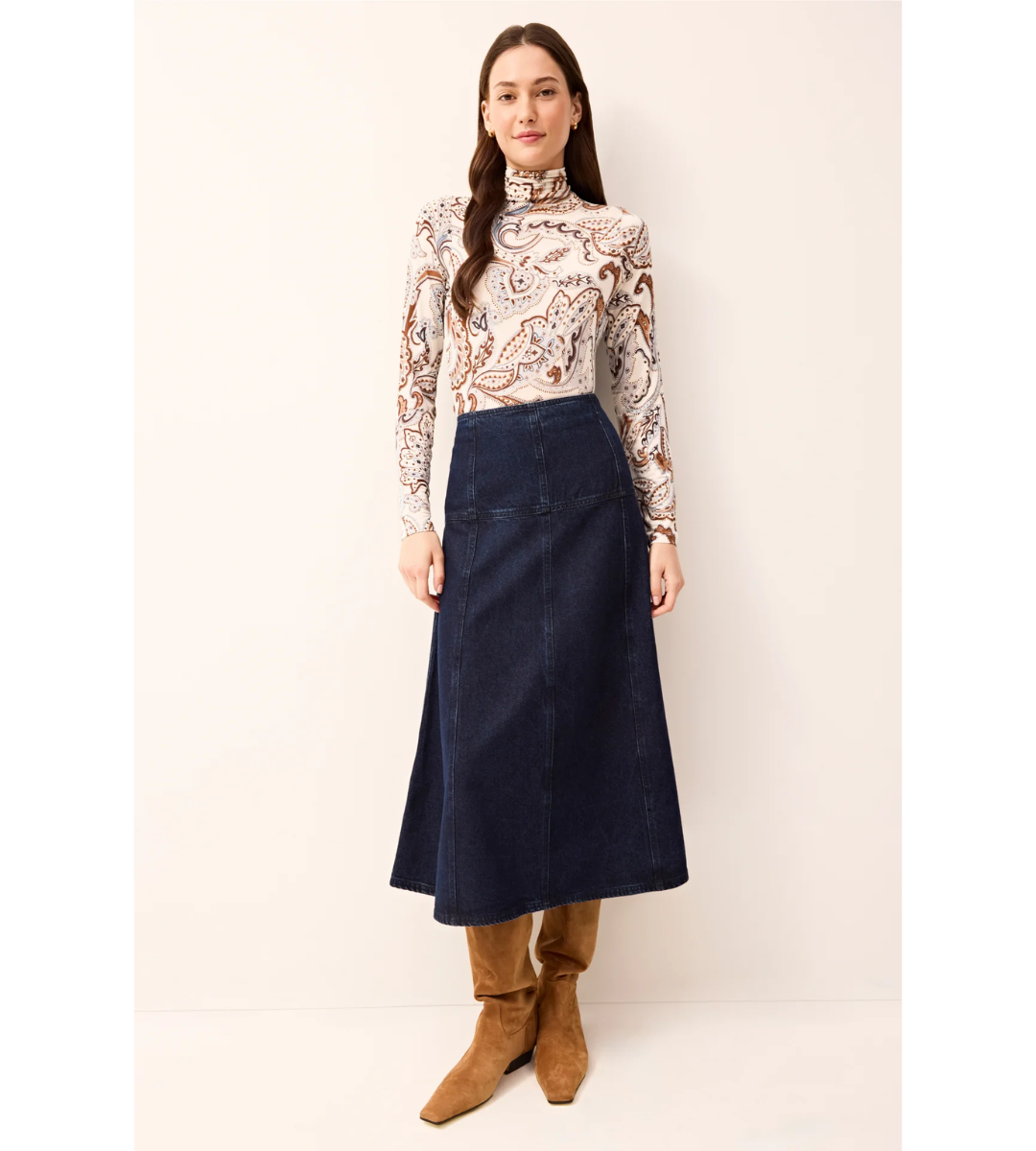 Cut from a soft and pliable dark wash denim, Yuko is fitted through the waist and hips. The A-line midi styles well with boots and sweaters, but it looks just as chic with blouses, tanks, and tees, so prepare to wear this flattering silhouette on repeat now through spring.
