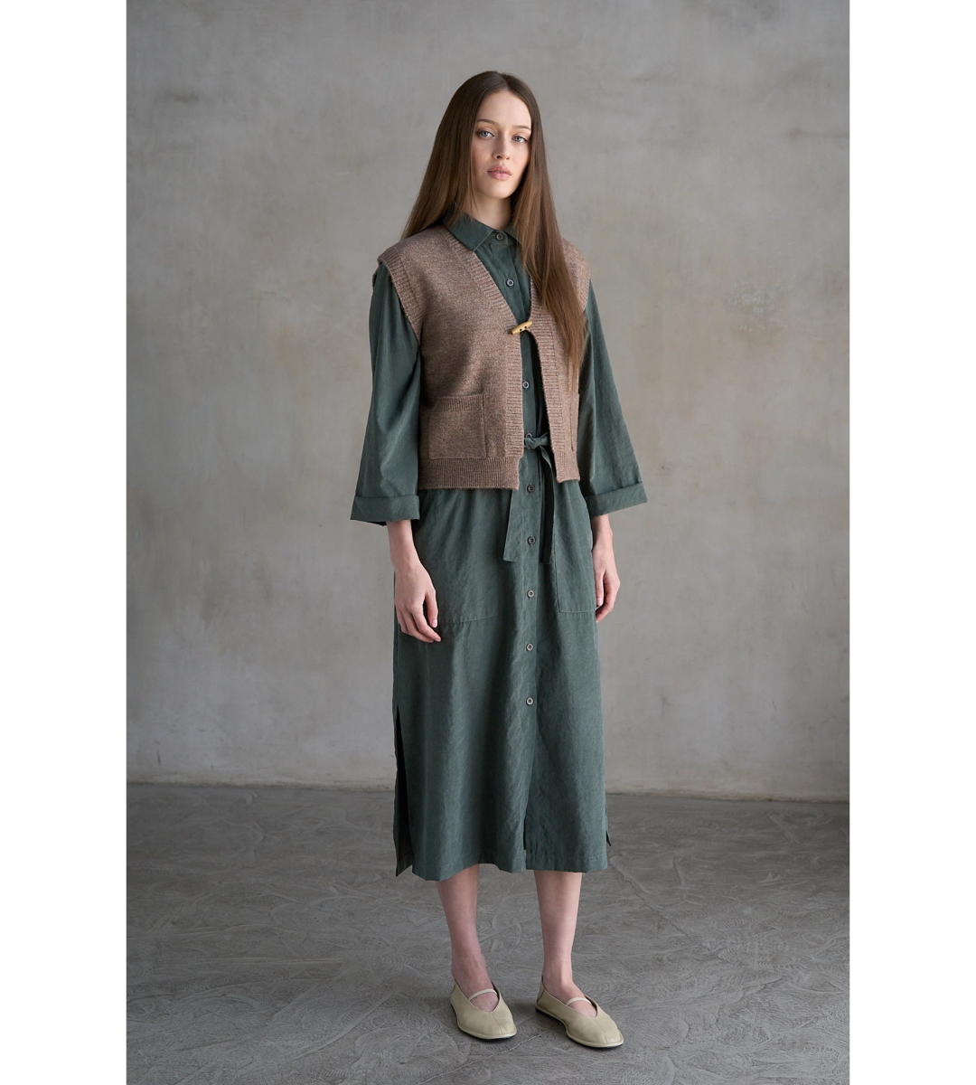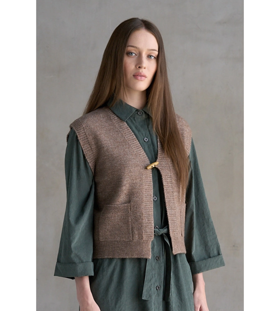 The Cheyenne Vest is a versatile, V-neck sleeveless vest featuring a relaxed fit for easy layering. It includes front horn-style buttons that add a rustic accent, while two patch pockets provide practical functionality. Ribbed edges lend subtle structure, making it a stylish yet effortless piece for everyday wear.