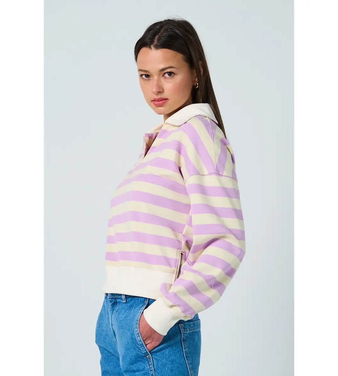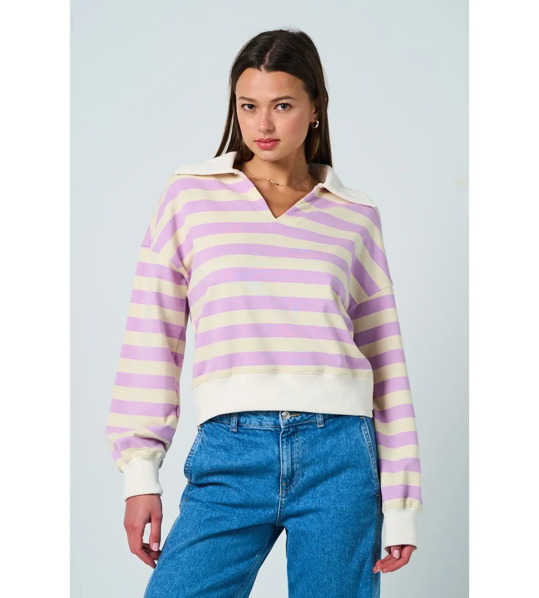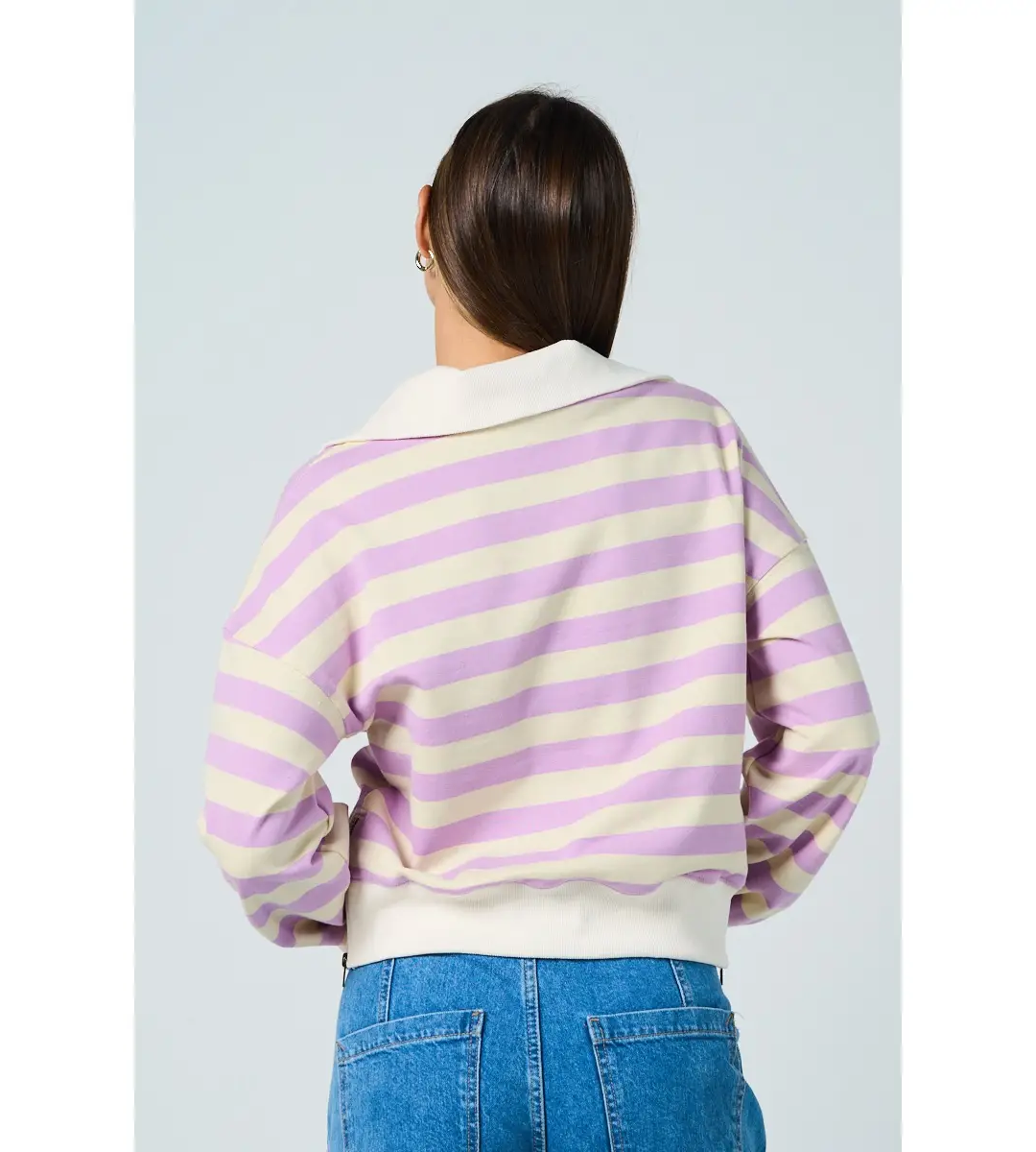 Add a soft and cheerful touch to your outfit with the Electra Top in lavender and cream stripes. The gentle pastel hues bring a fresh, fun mood to any occasion. Designed with a flattering V-neck and subtle side zippers, this top balances charm and versatility. Made from a breathable cotton blend with stretch, it’s perfect for mixing and matching with your favorite pants, skirts, or shorts while maintaining a stylish edge.