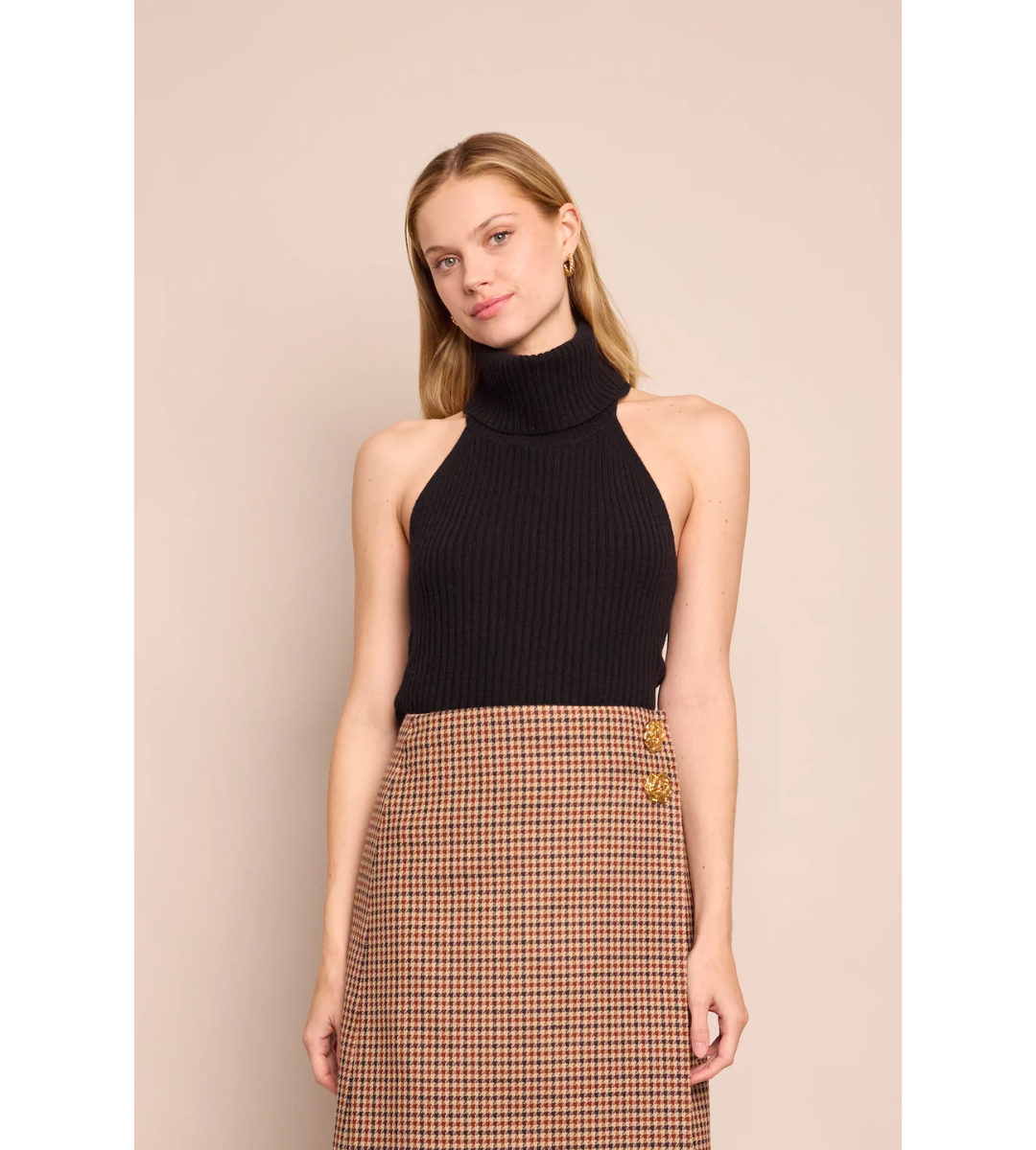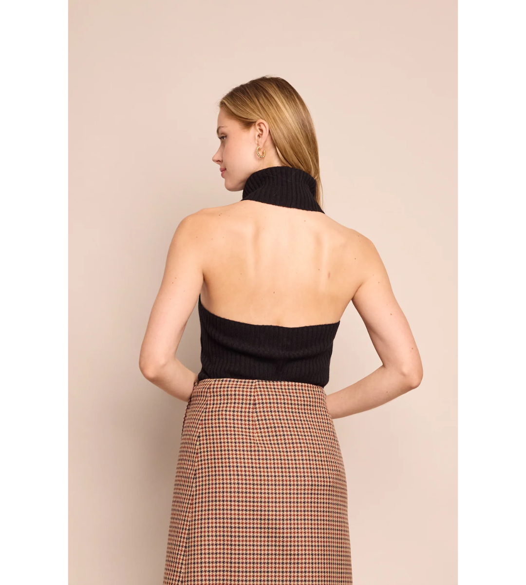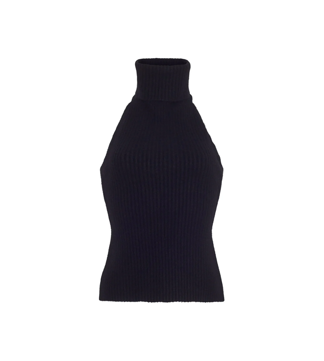 The form-fitting Samson Top is a ribbed knit open back halter with a luxurious, oversized turtleneck. The vertical rib knit stitch creates a figure-flattering silhouette.