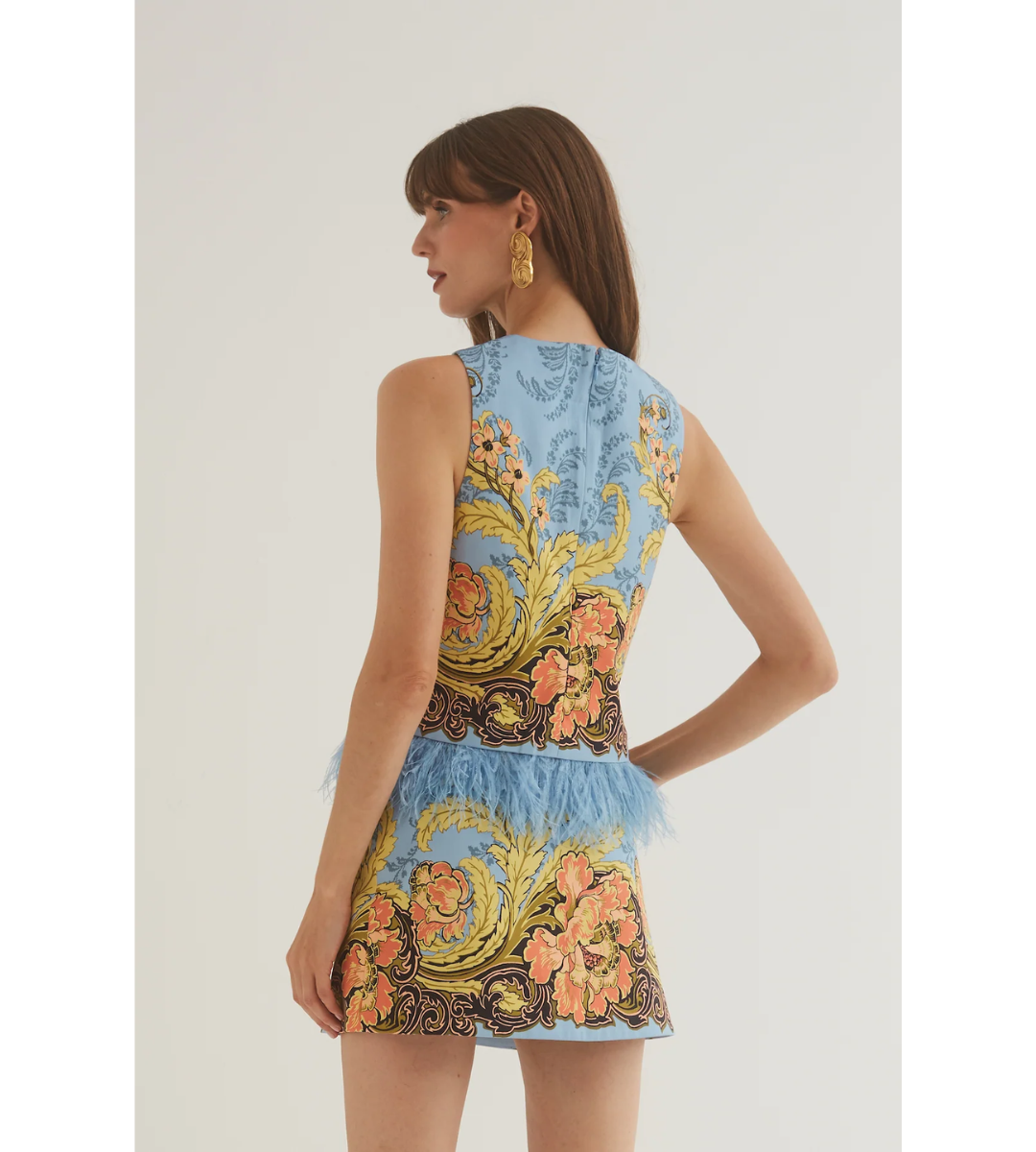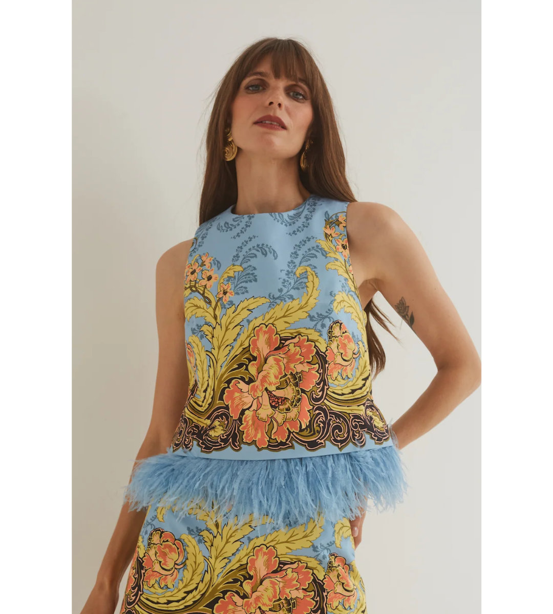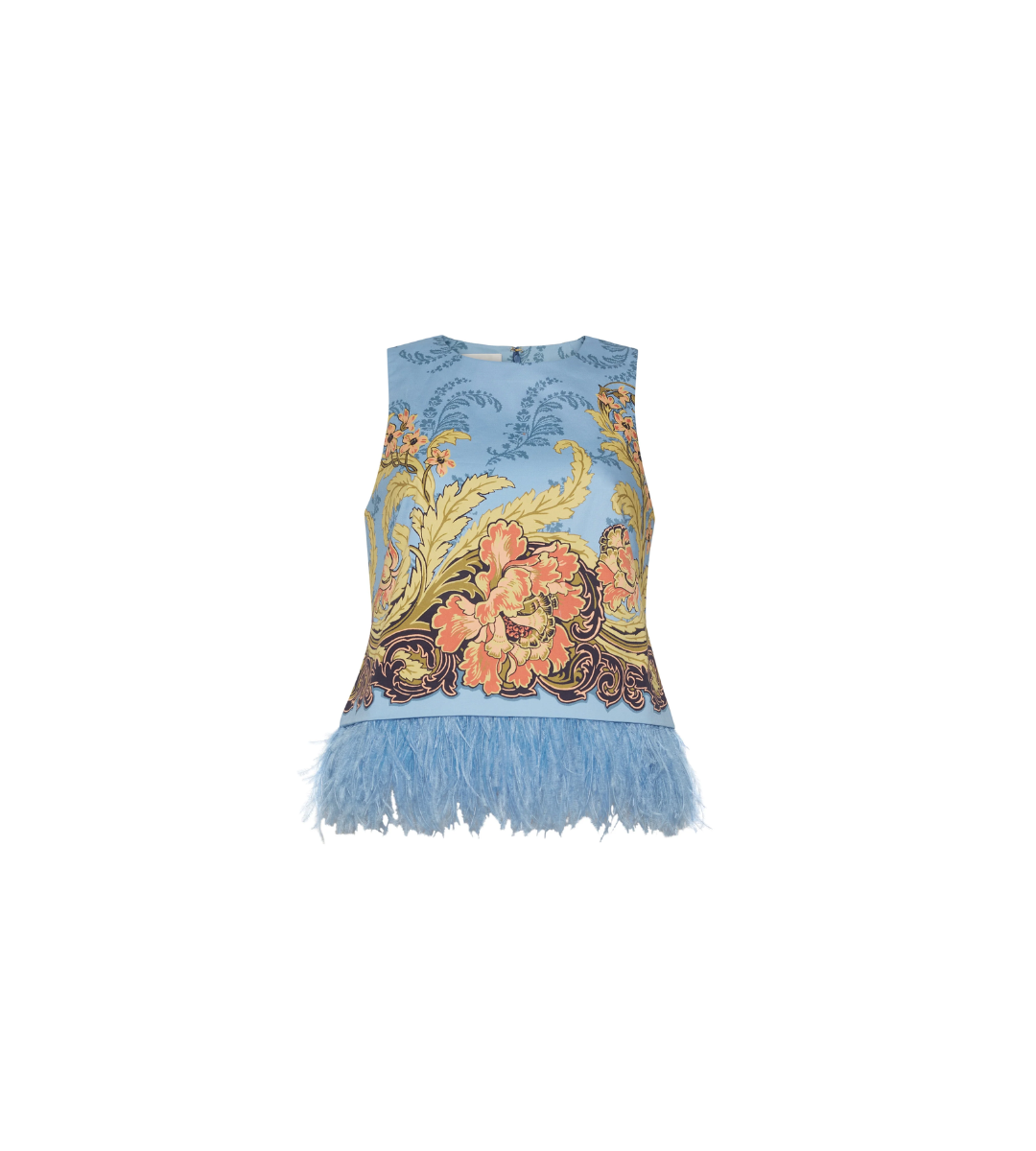 - Easy scoop neck sleeveless top with ostrich feathers at hem