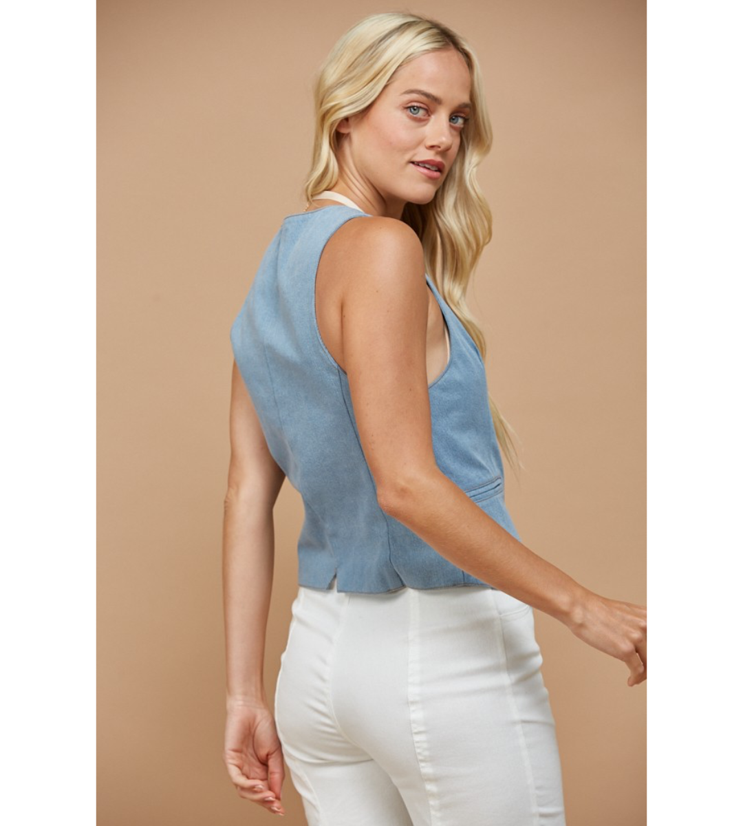 Brighten your wardrobe with the Acacia Vest in light denim. Featuring a structured design and a fitted waistline, this vest combines casual ease with a sharp, tailored look. The lighter wash adds a fresh, versatile vibe, making it an ideal layering piece for any season.
