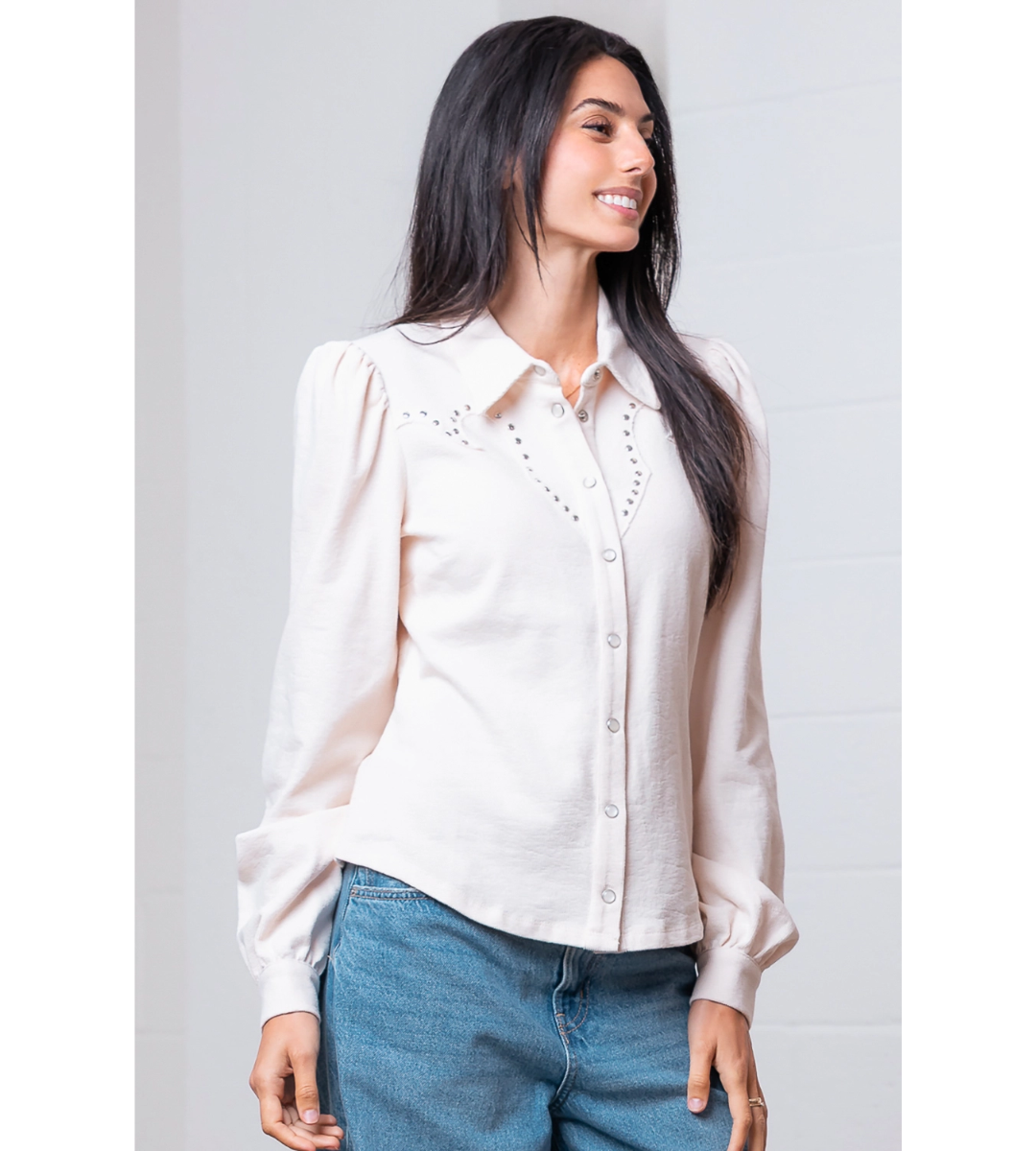 The Aveline Top blends classic charm with a modern edge. This cream-colored blouse features a soft, non-stretch fabric with a designed yoke accented by subtle stud detailing. Complete with long puff sleeves, a collared neckline, and a button-down front, it offers a relaxed fit that’s both polished and effortlessly chic. A refined staple with just the right amount of attitude.