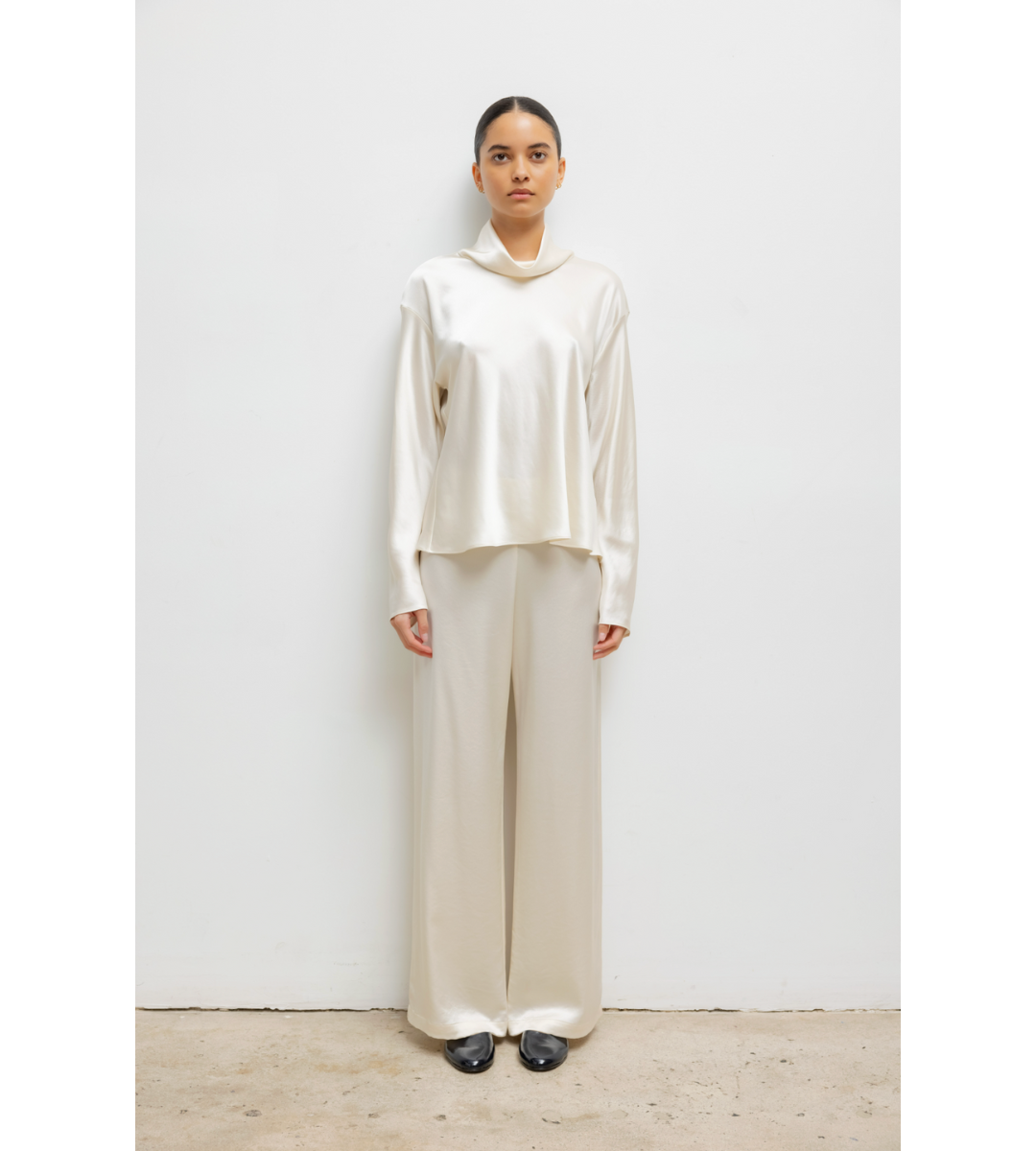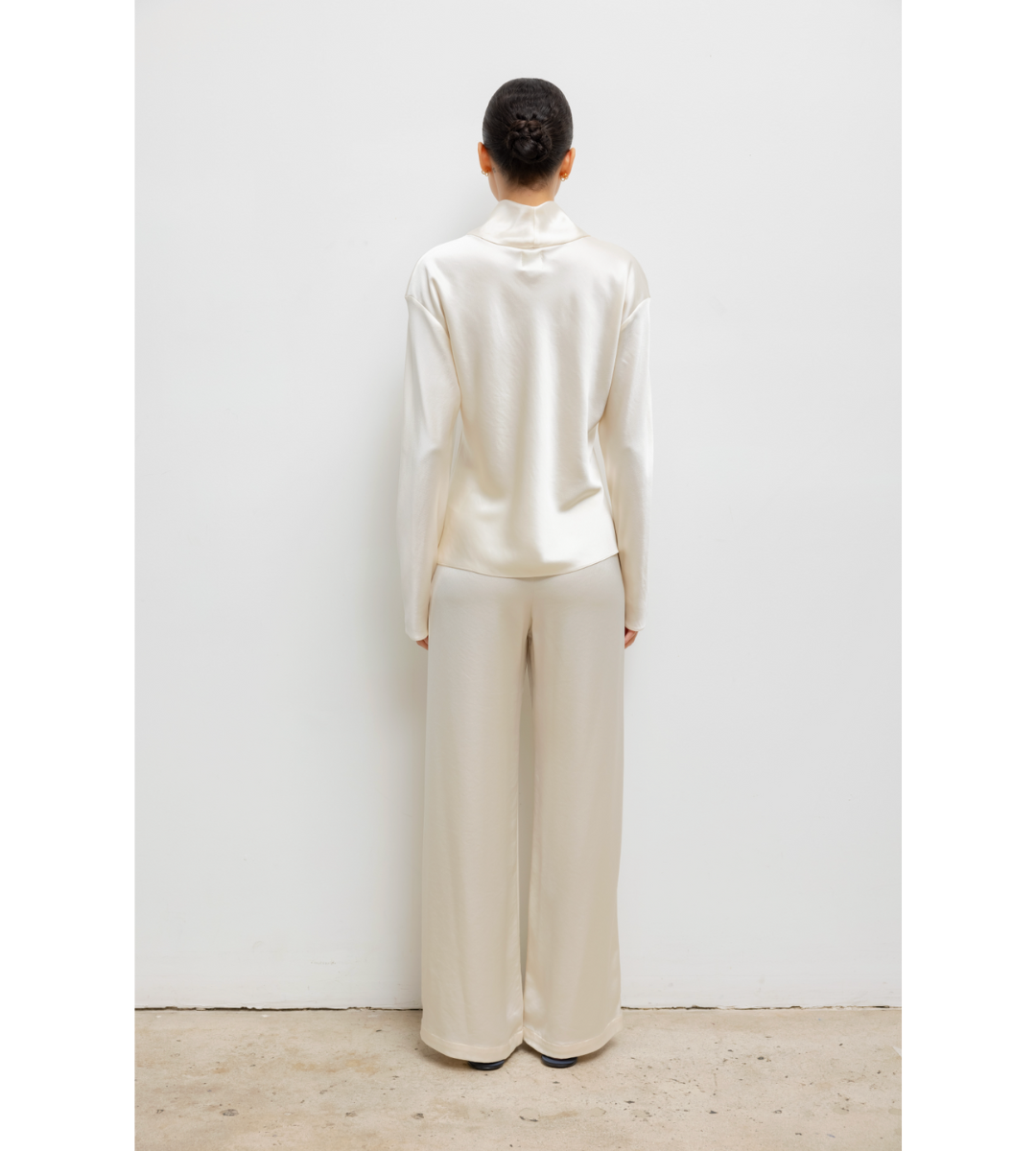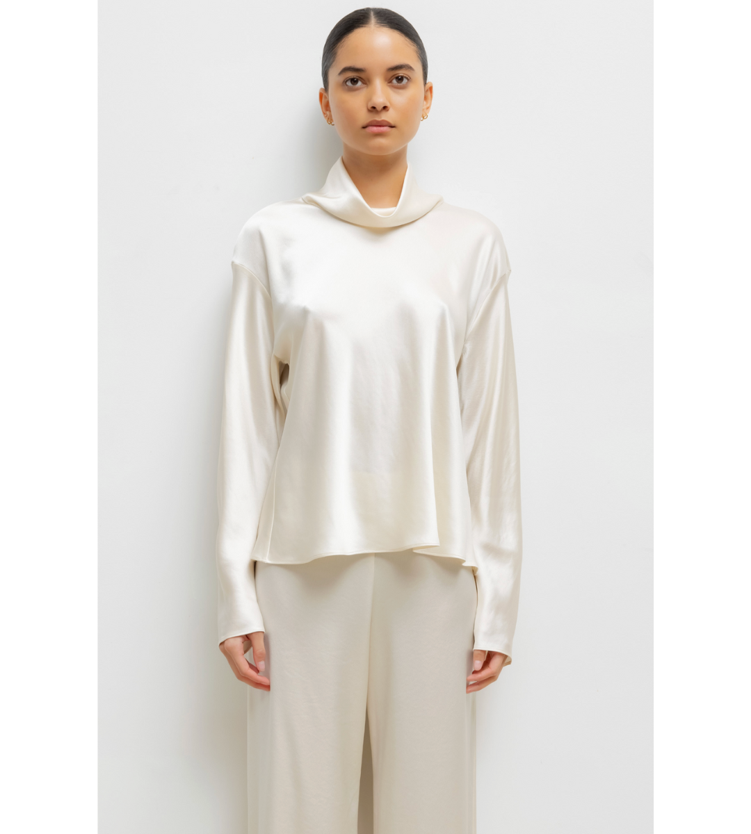 Cut in best-selling Japanese-crafted Barb Satin, The Barb Long Sleeve Cowl Neck is a classic long sleeve top, featuring a perfectly draped cowl neckline and tuckable length. Make it a matching set with any Barb Bottom.