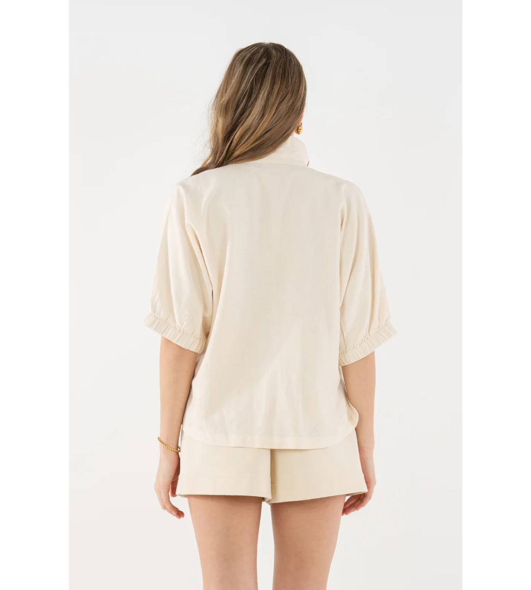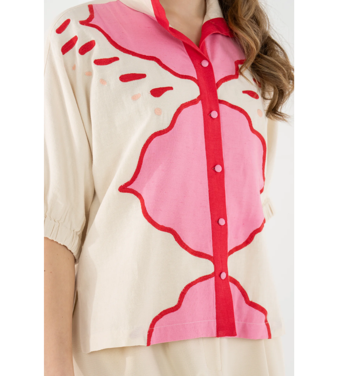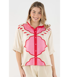 The Bonny Top in Pink Palace draws inspiration from the ornate geometric designs and romantic hues of Jaipur’s storied architecture. Intricate embroidery adds dimension and artistry, creating a striking interplay of pattern and texture.