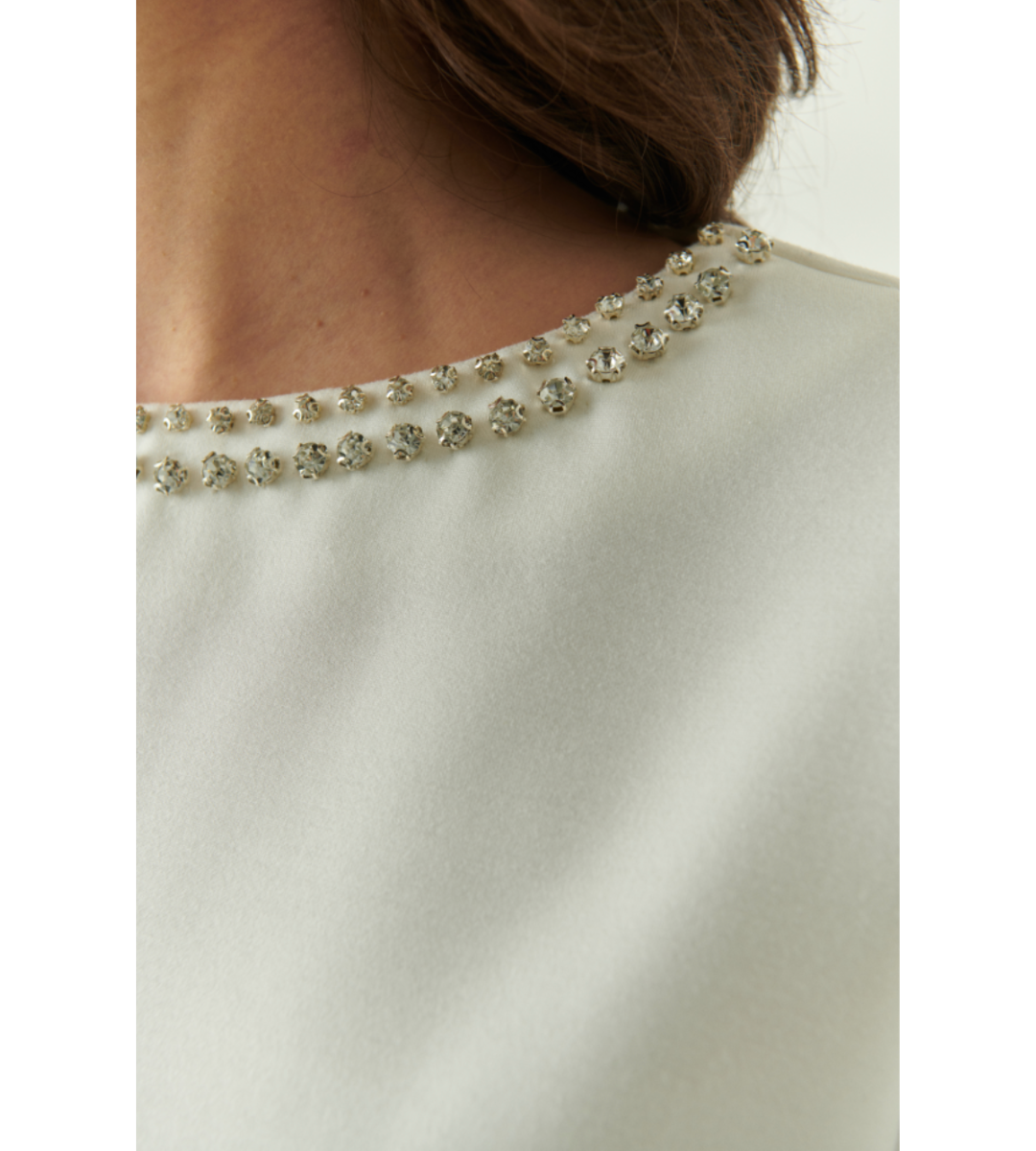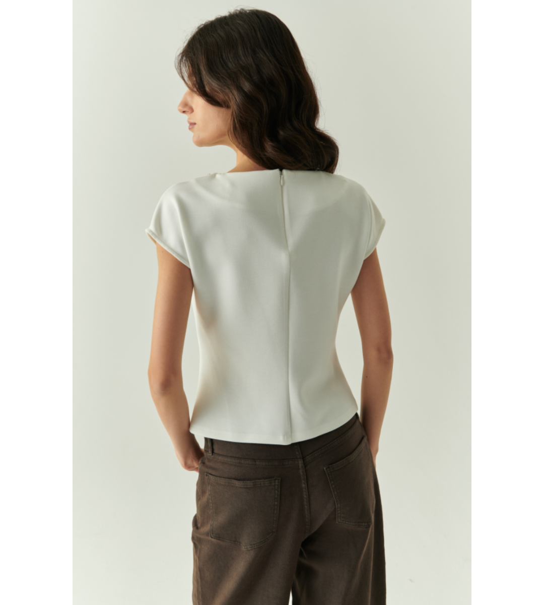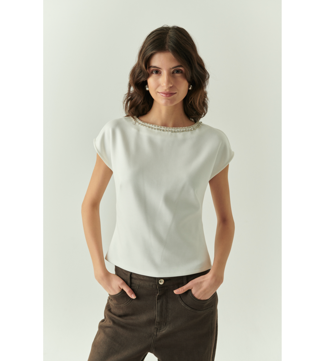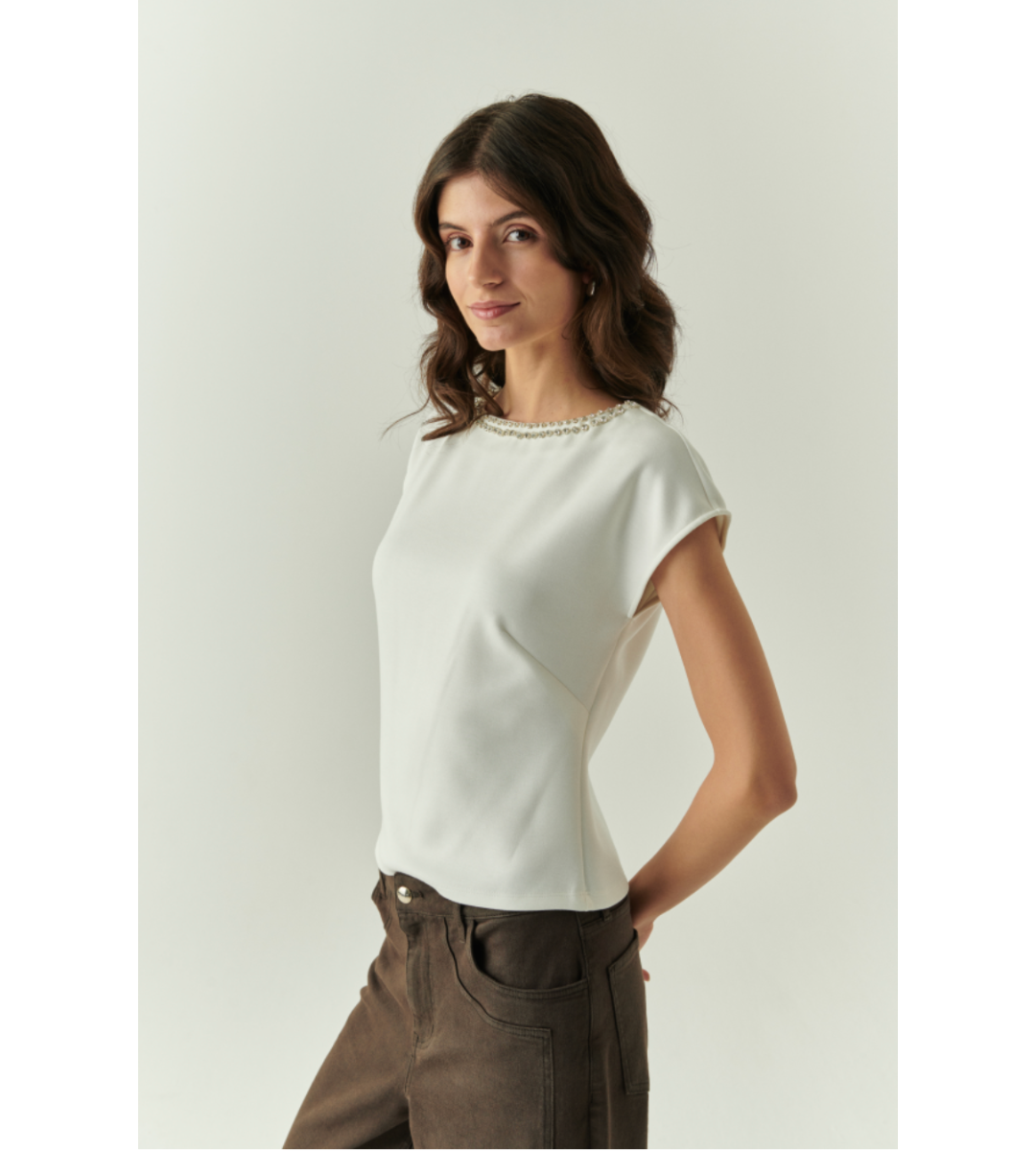 Elevate your everyday style with the Scout Top in bone. Crafted from a smooth, structured fabric, this versatile piece features a relaxed cap sleeve silhouette and a flattering, tailored fit. The neckline is delicately adorned with shimmering beaded embellishments, adding a touch of understated glamour to your look. Perfect for pairing with tailored trousers for the office or denim for an elevated casual feel.