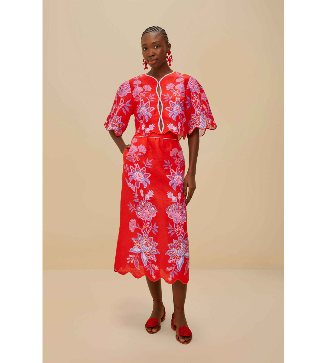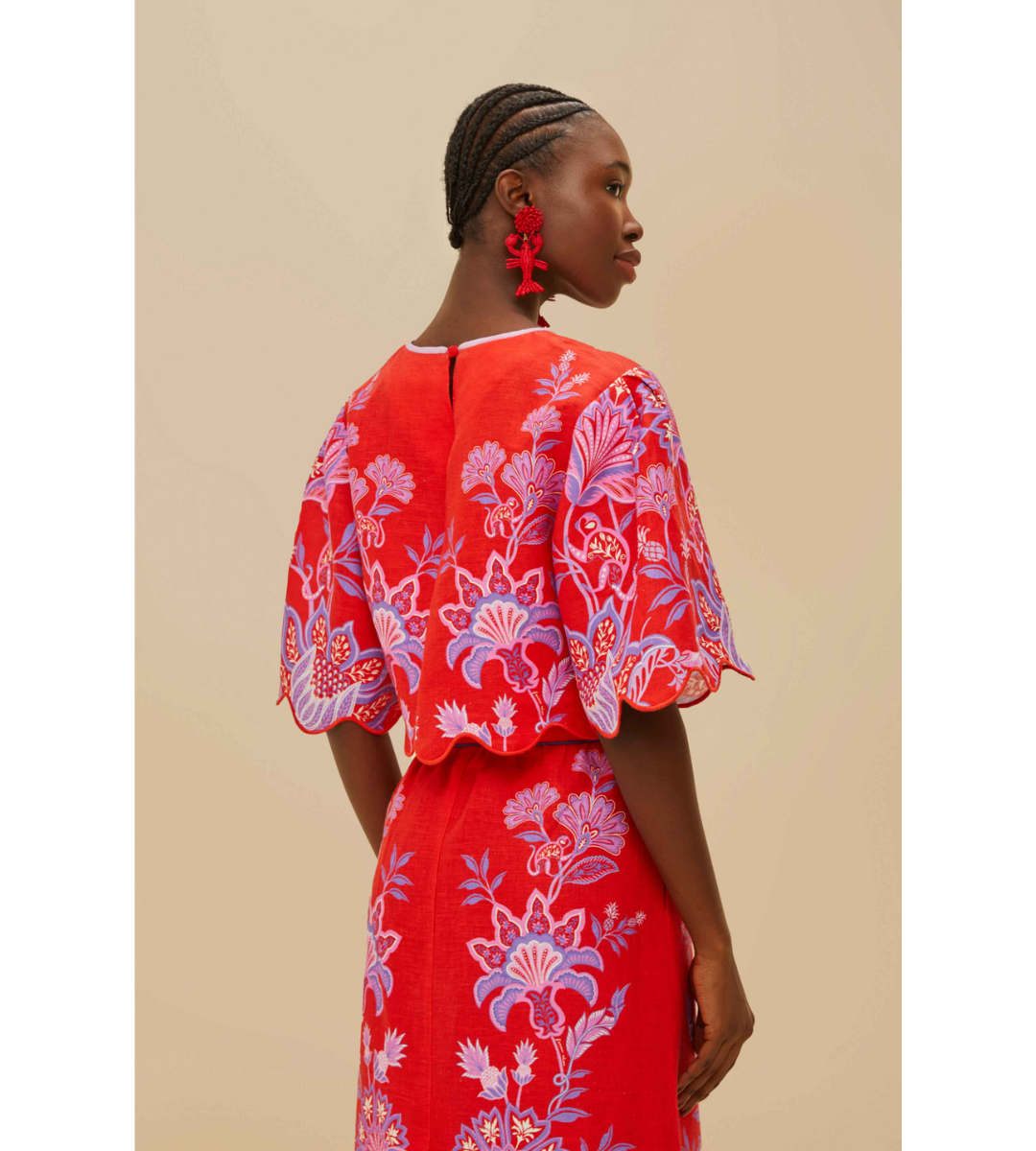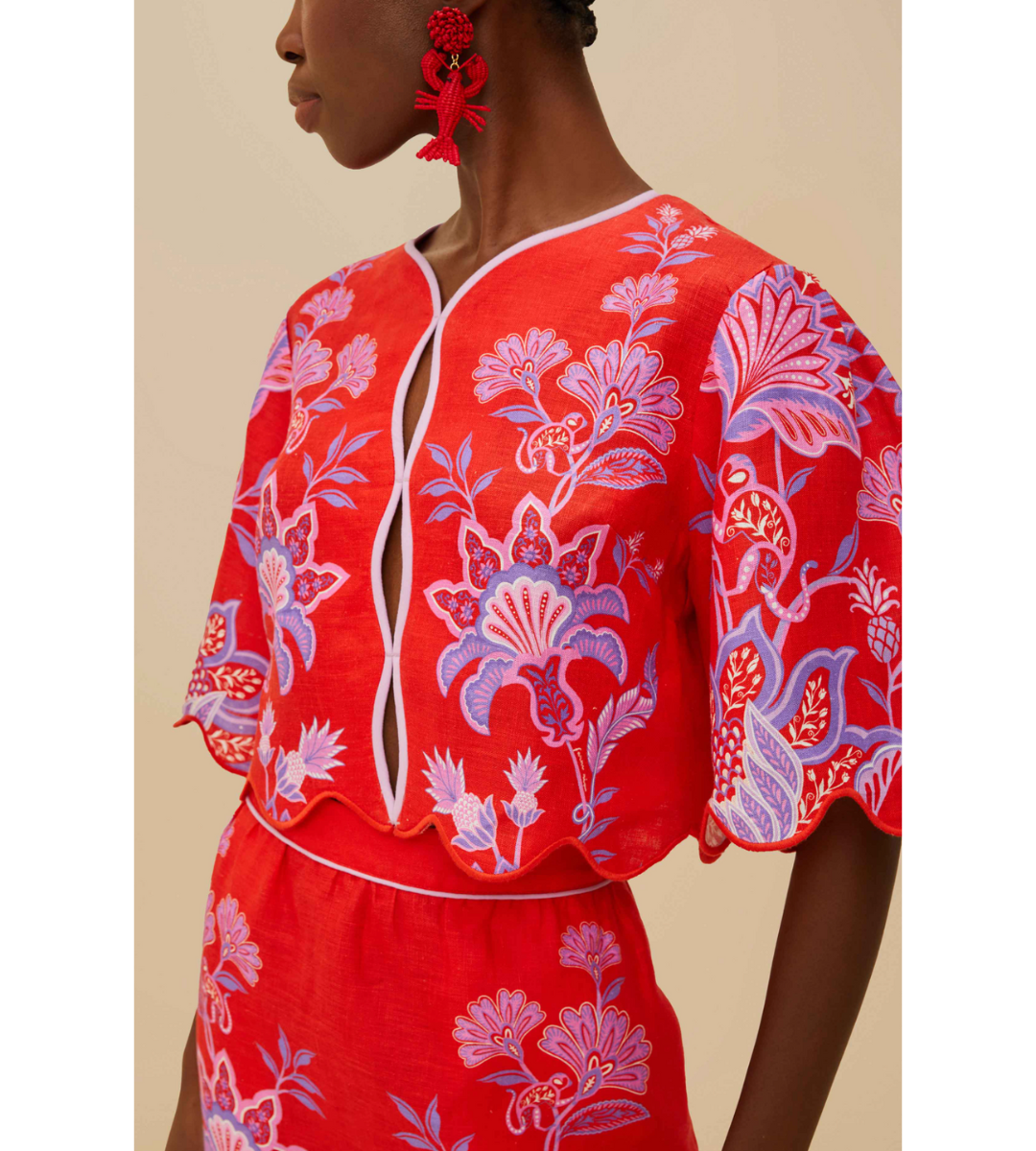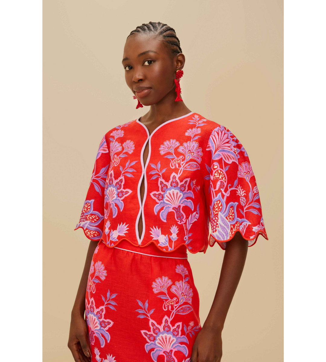 Delicate yet bold, the Porcelain Garden red blouse brings a romantic touch to everyday style. Featuring a slightly cropped fit and intricate scalloped edges, this piece blends feminine charm with a modern silhouette. The vibrant red hue adds a striking pop of color, while the refined detailing offers an elegant finish—perfect for pairing with the matching midi skirt.