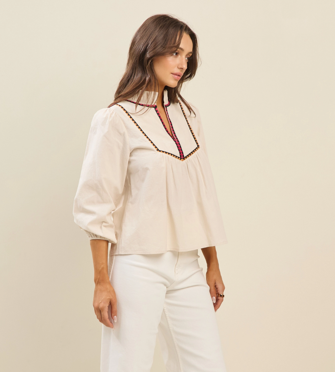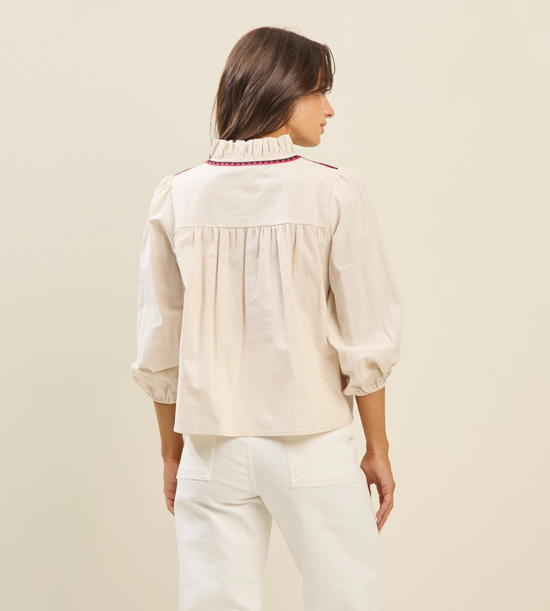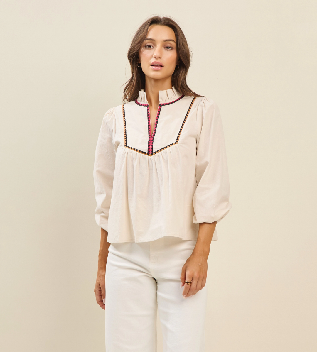 Delicate and effortlessly charming, the Gaia Top in soft ecru is a wardrobe essential. Featuring intricate embroidery details and flattering 3/4 sleeves, this top blends timeless craftsmanship with everyday comfort. Its relaxed fit and subtle texture make it perfect for pairing with jeans or skirts, adding a touch of understated elegance to any outfit.