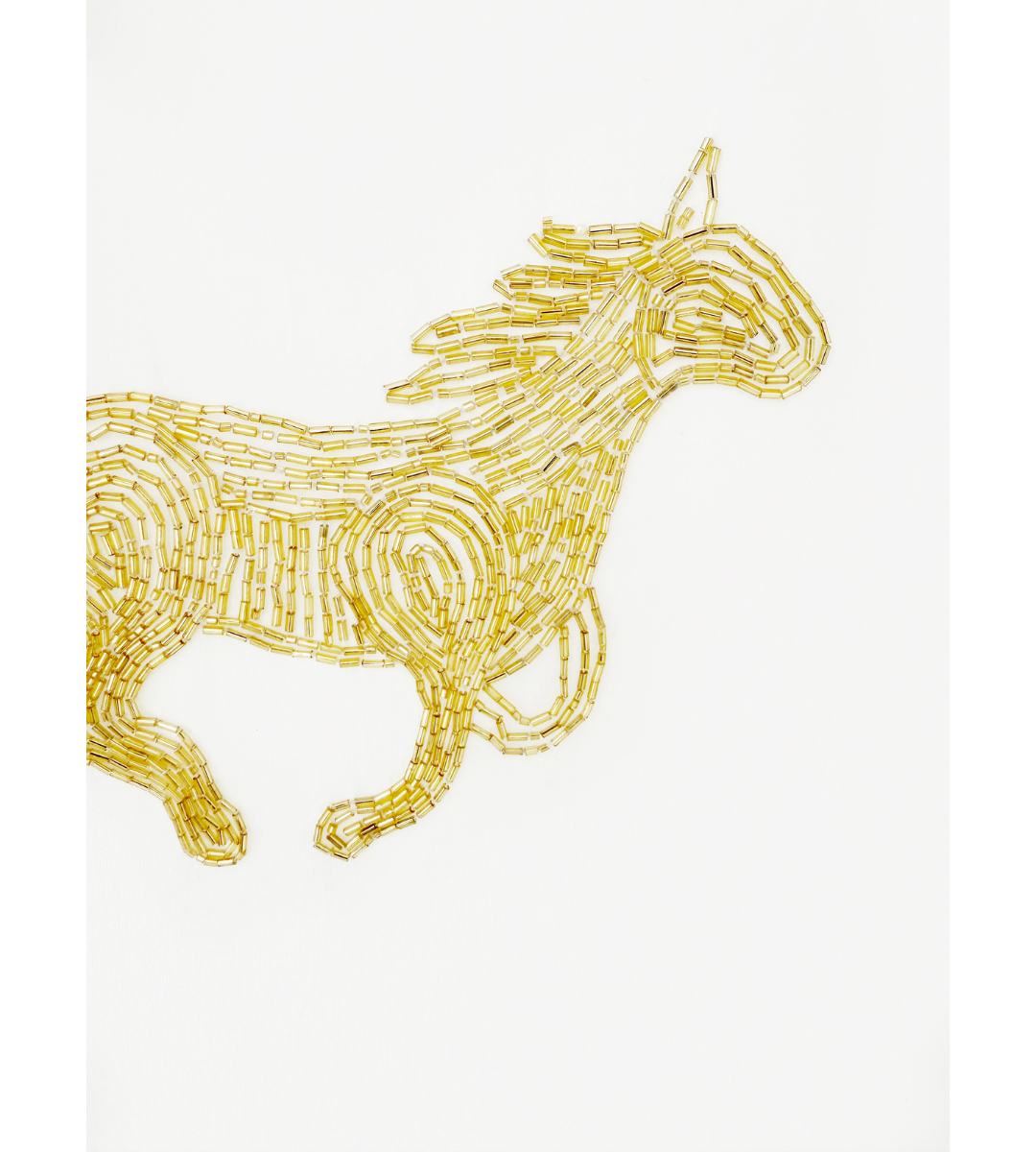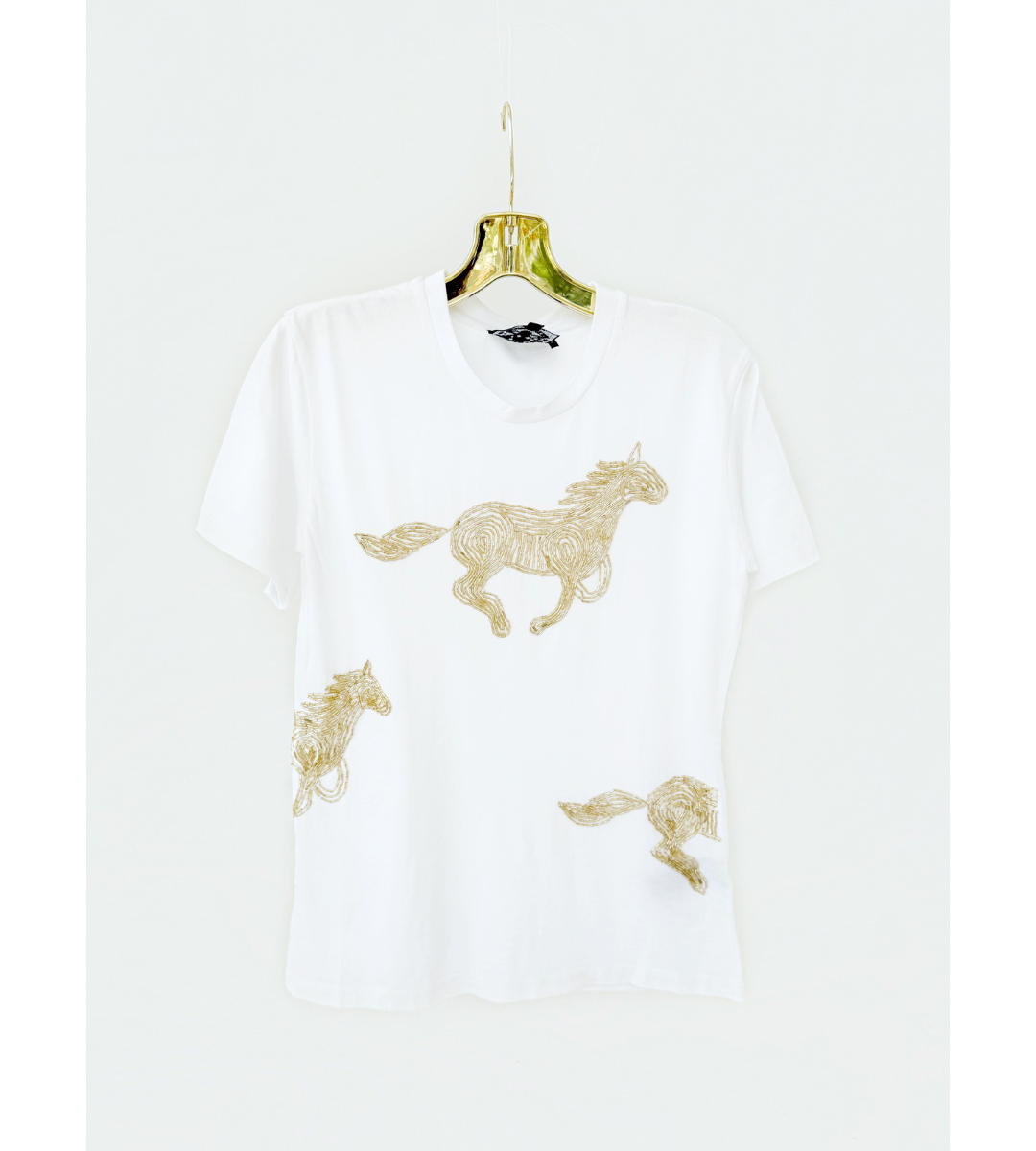 This isn't your basic white tee. Featuring a stunning gold beaded horse design, it blends casual comfort with a touch of luxe. The intricate beadwork adds eye-catching detail and equestrian charm—perfect for dressing up denim or layering under a blazer for a chic, laid-back look.
