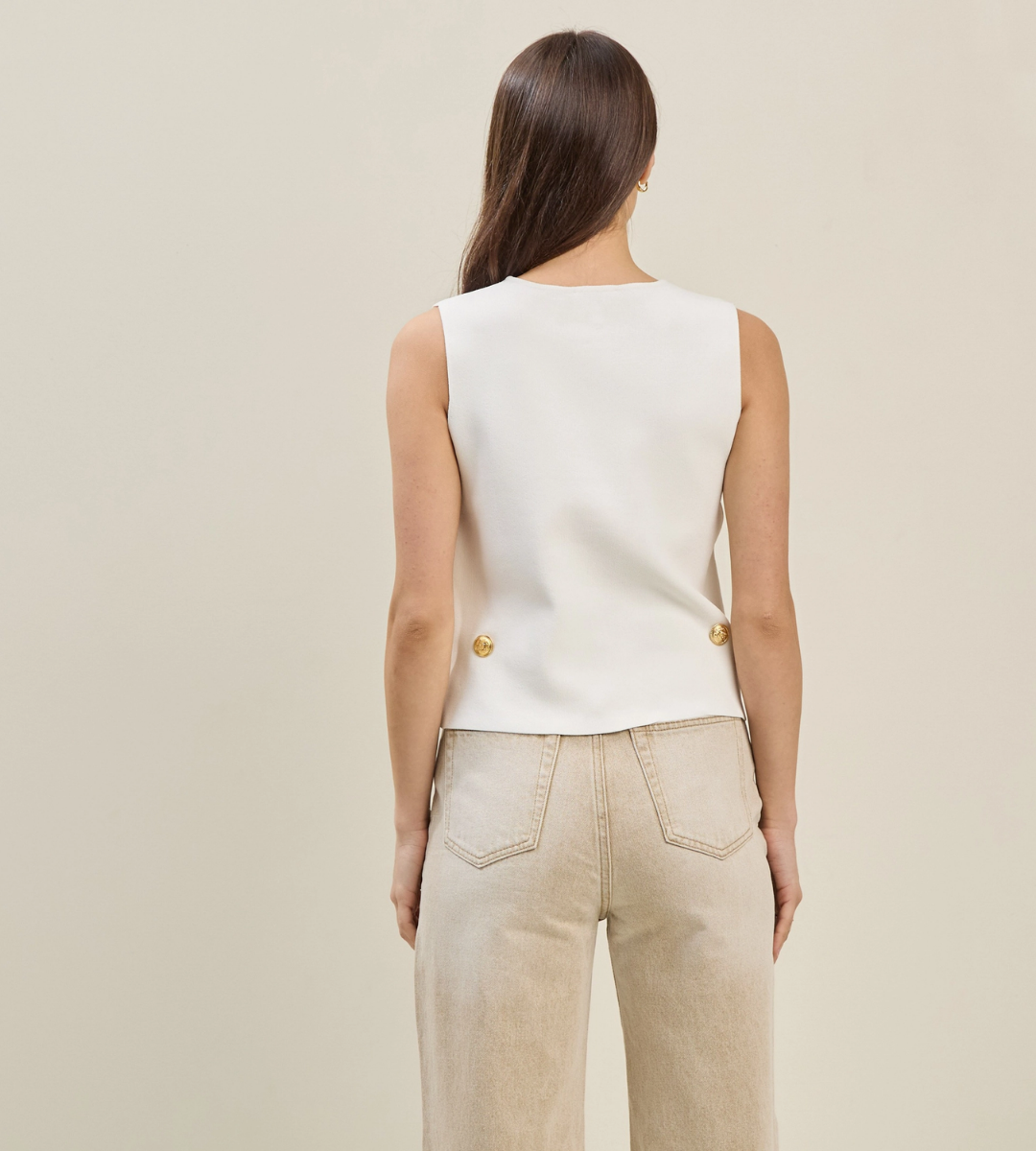 Brighten up your wardrobe with the Lemon Top — an ivory sleeveless sweater top that’s both simple and sophisticated. Featuring elegant gold buttons down the front, this versatile piece adds a subtle touch of shine to your look. Perfect for layering or wearing solo, the soft knit fabric ensures comfort while the classic design keeps it effortlessly chic.