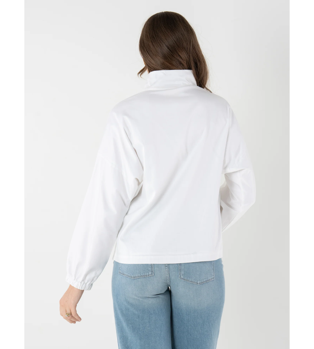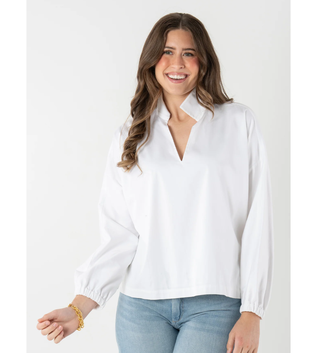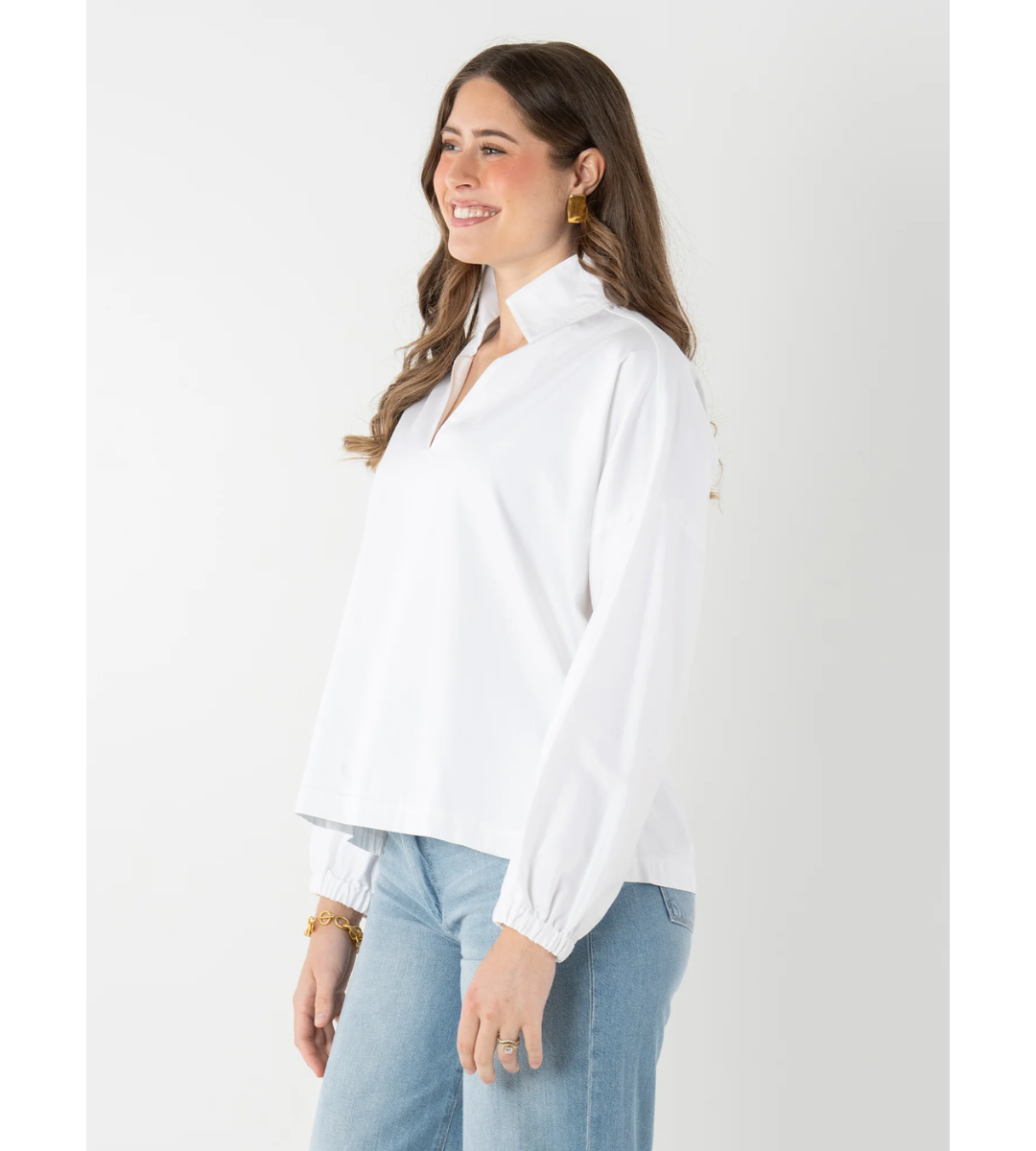 Clean, crisp, and endlessly versatile, the Long-sleeve Poppy in White Cotton Poplin is a wardrobe staple designed for year-round wear. Featuring a structured stand collar, long elastic dolman sleeves, and a relaxed silhouette, this top offers effortless comfort with a polished finish. The breathable cotton poplin keeps you cool, while the timeless design transitions seamlessly from casual outings to elevated lounging. A true capsule essential.