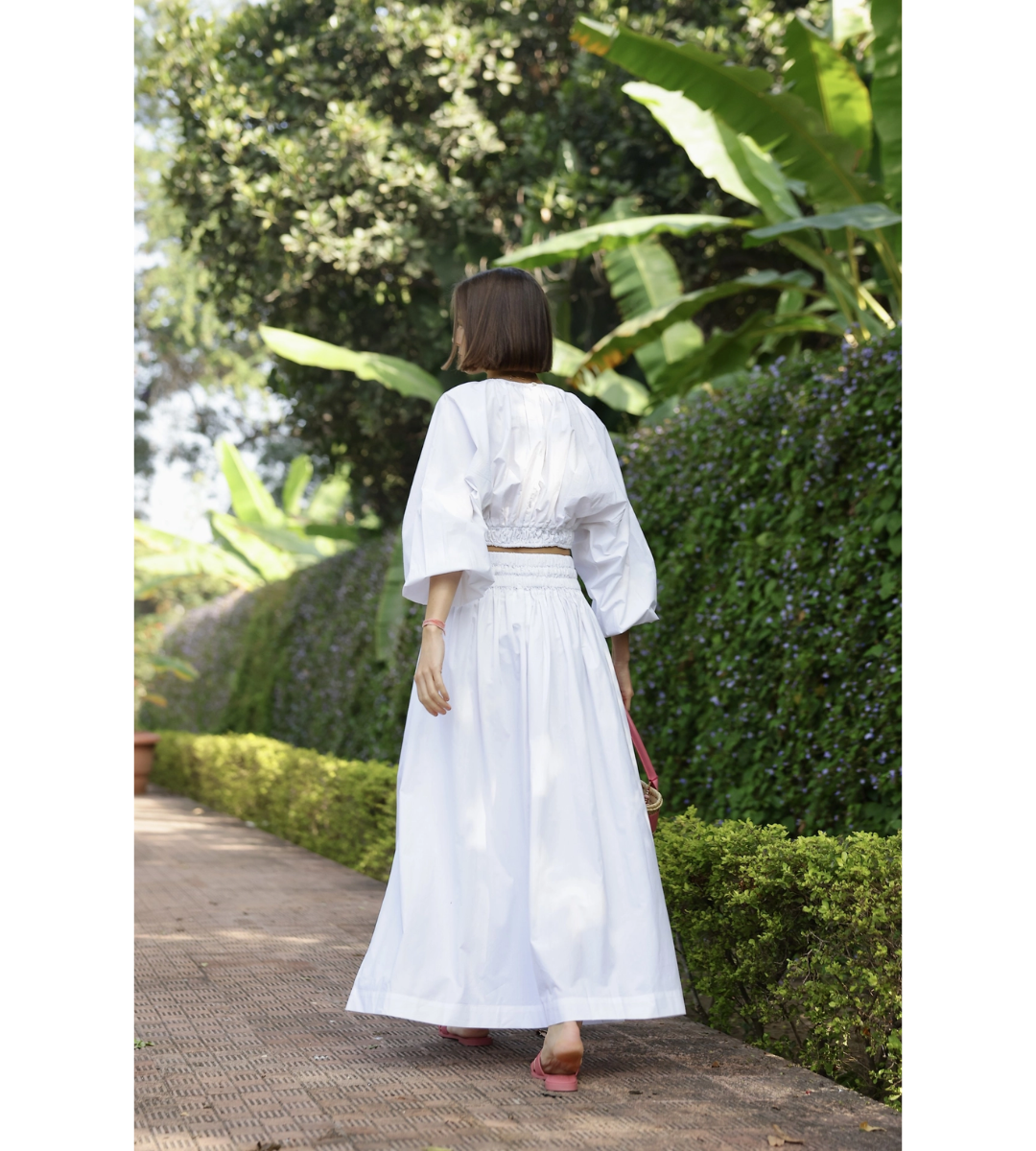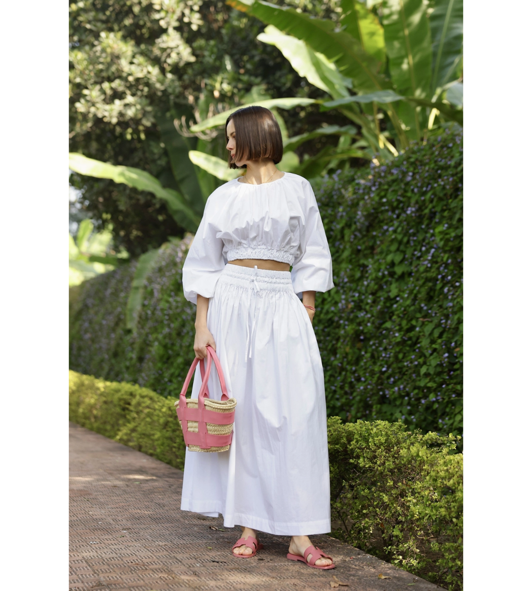 Breezy, bold, and effortlessly chic — the Newport Top is your sunshine-ready essential. Made from lightweight cotton poplin in a vibrant white, this cropped silhouette features voluminous 3/4 sleeves and a gathered elastic hem and neckline for a comfortable, flattering fit. Perfect for warm days and vacation escapes, it pairs beautifully with your favorite high-waisted bottoms.