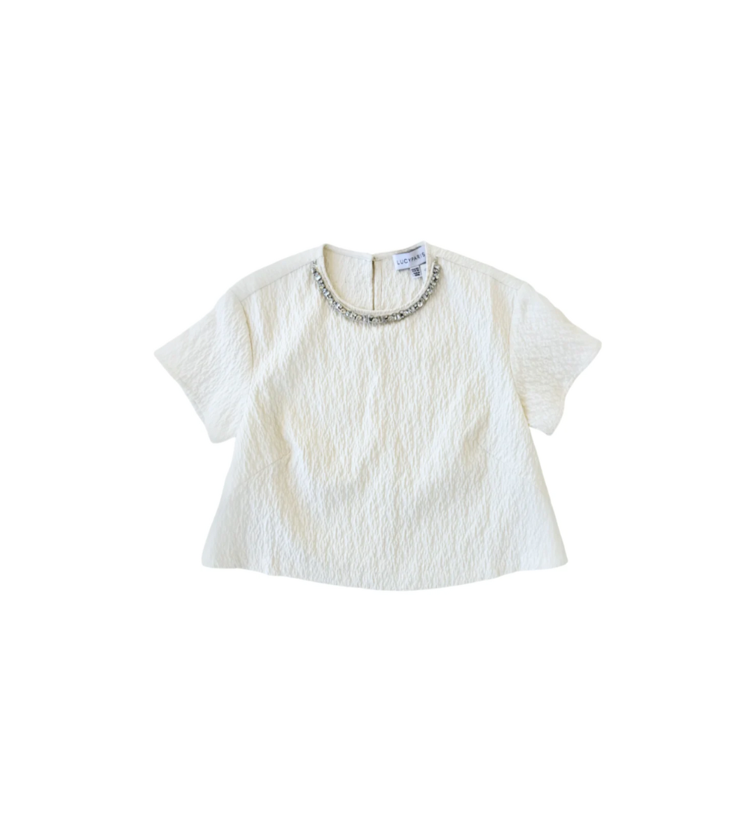 Refined and radiant, the Patricia Top brings effortless elegance to your wardrobe. Crafted from textured ivory fabric, this cropped silhouette is elevated with a jeweled neckline that adds just the right touch of sparkle. Perfect for special occasions or dressing up your everyday look, it pairs beautifully with high-waisted skirts or tailored trousers. A timeless piece that blends classic sophistication with modern charm.