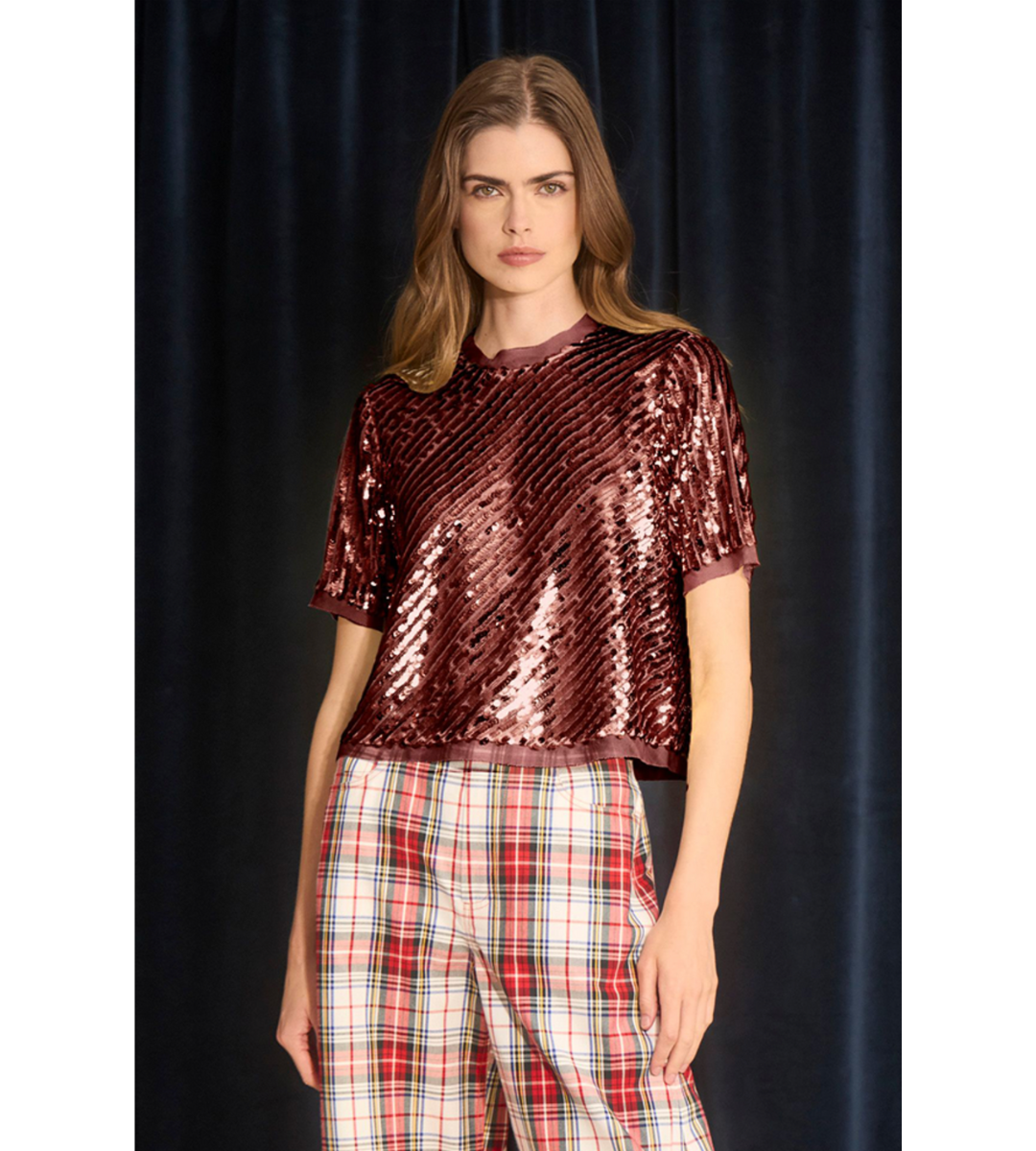 Meet the Pixie Top — your must-have statement piece for the holiday season. This slightly cropped silhouette dazzles with diagonal sequins in a rich mulberry hue, catching the light with every move. Chic yet playful, it’s perfect for pairing with high-waisted trousers or a sleek skirt for festive parties and nights that sparkle.
