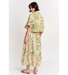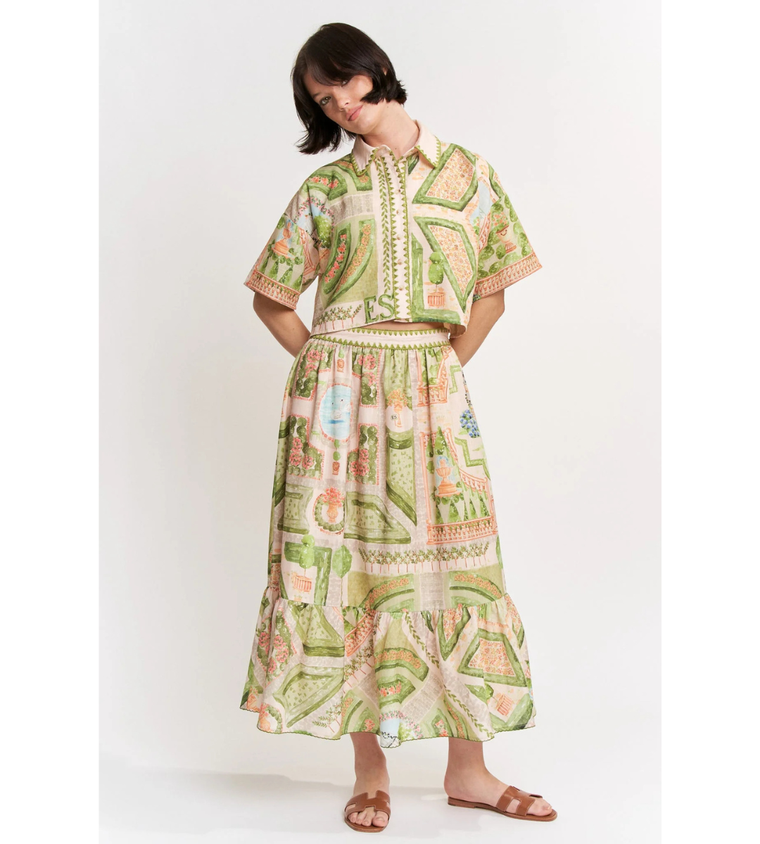 The Sariyah Shirt features a linen, soft garden landscape with contrast stitching and cropped length.