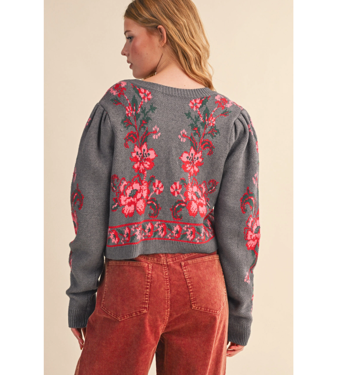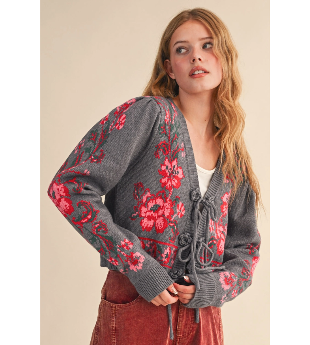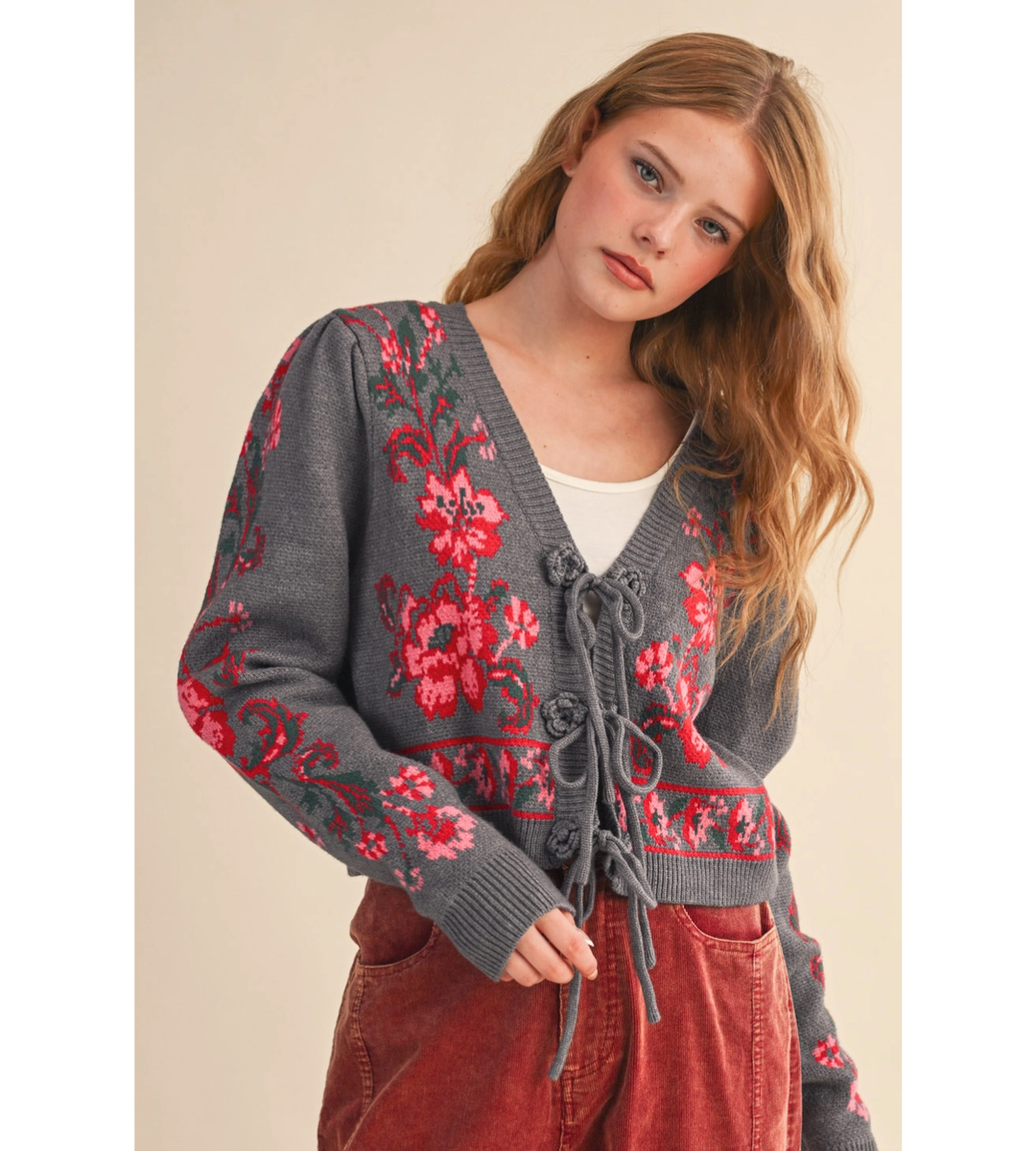 Romantic with a touch of vintage charm, the Winslet Sweater is a standout layering piece. This cropped knit cardigan features a rich charcoal base with a bold red floral border design, bringing warmth and elegance to any look. The V-neckline is accented with delicate knit rosettes and triple bow tie closures for a feminine finish. Gathered puff shoulders and fitted long sleeves add shape and texture, making the Winslet a perfect piece to pair with high-waisted denim, skirts, or over a slip dress for a soft statement look.