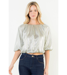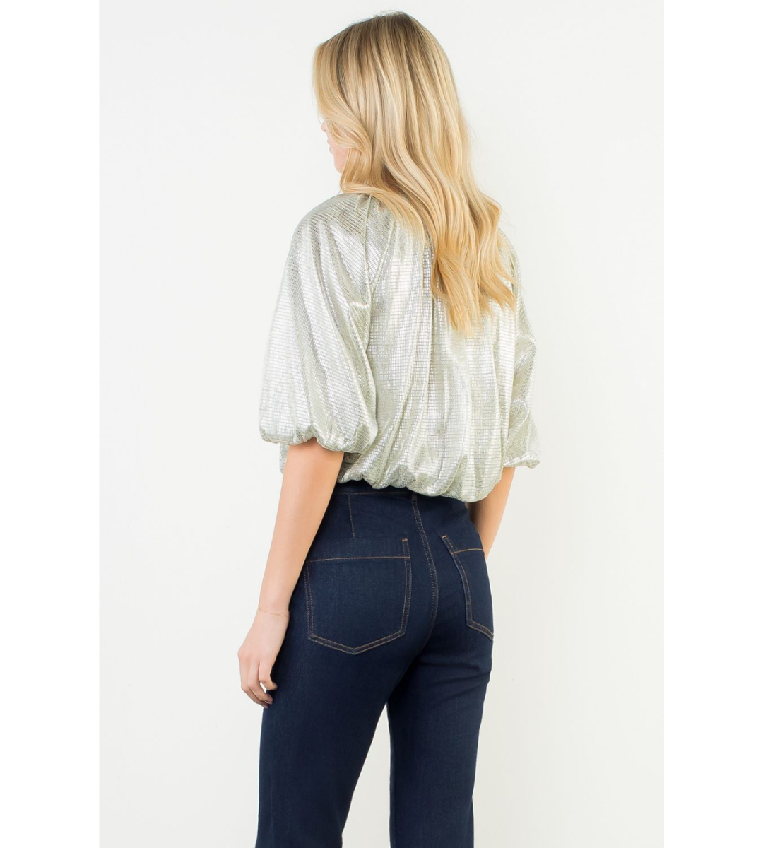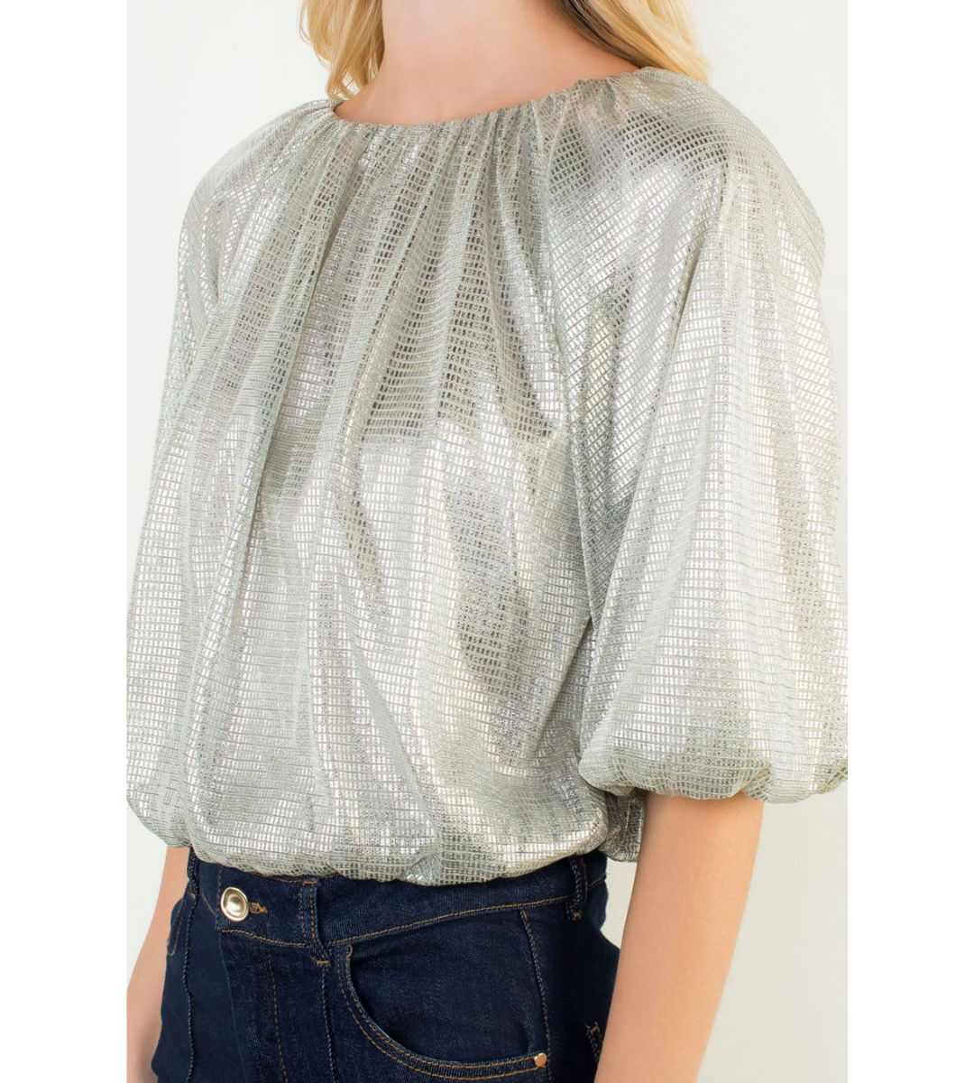 Add a luminous touch to your wardrobe with this Silver Metallic Bubble Blouse, a chic and airy piece designed for those who love a bit of shimmer. This top combines a relaxed silhouette with a high-impact finish, making it a versatile staple for both day and night.